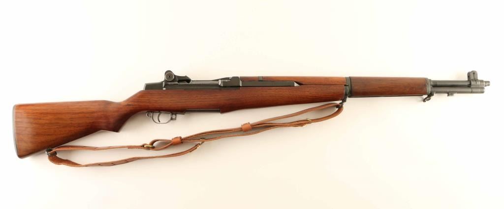 Rebuilt WWII era U.S. Military clip-fed semi-automatic service rifle chambered in .30-06 Springfield, manufactured circa 1943. Features a parkerized finish, Danish 24" barrel dated 3-61, shrouded blade front sight, adjustable rear aperture sight with '[anchor]/1003" marked cover, bayonet lug, stacking swivel, smooth trigger, milled trigger guard, manual safety, "P.B." marked bolt, "SA" marked operating rod, trigger housing & hammer, smooth brown leather sling, smooth walnut handguards and semi-pistol grip shoulder stock with trapdoor metal buttplate. Rifle retains approximately 90% finish showing thinning on the trigger housing, slide wear on the bolt & receiver, some high point edge wear and a spot of finish loss on the left side of the receiver. Action is smooth, the bore appears frosty with good rifling, and the mismatched wood stocks are fine. Condition is NRA Very Good. ***C&R Firearm***