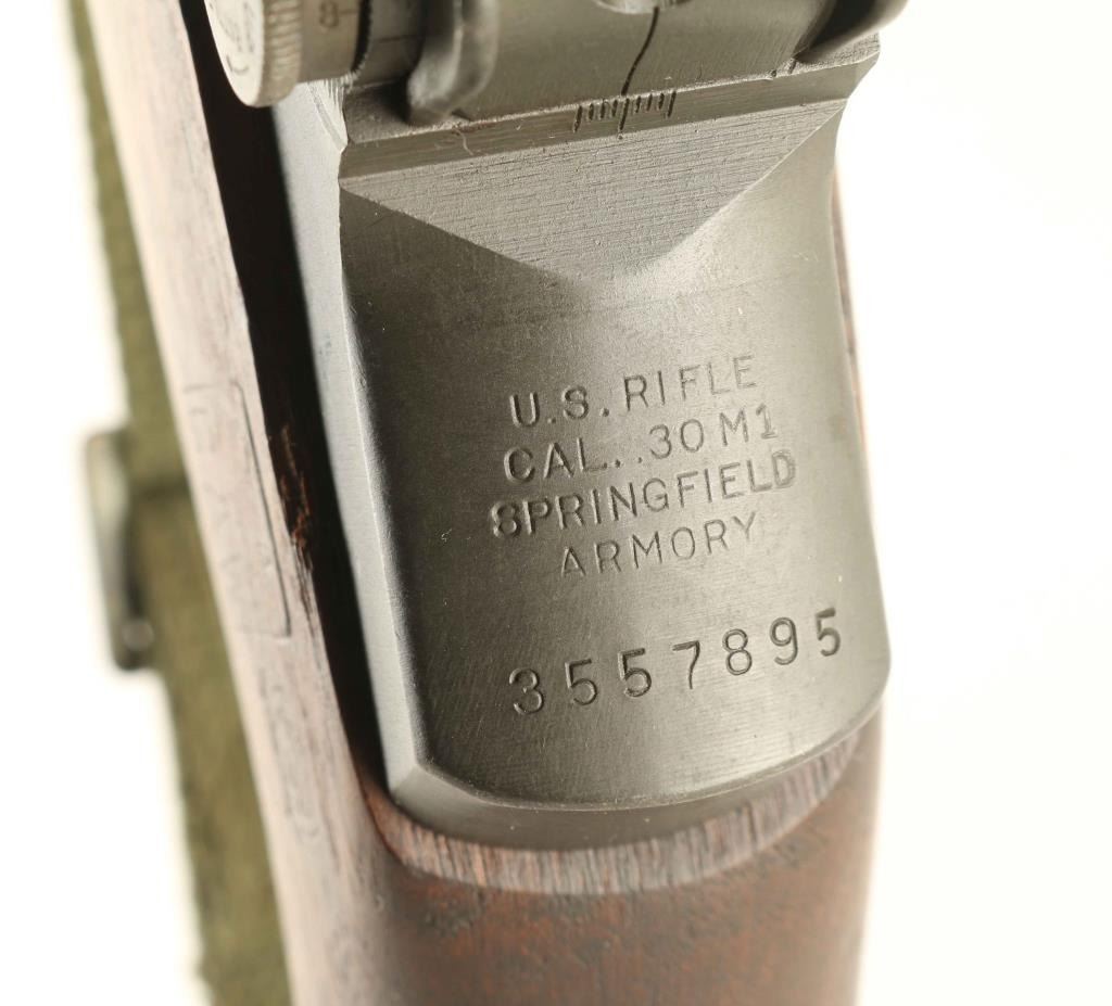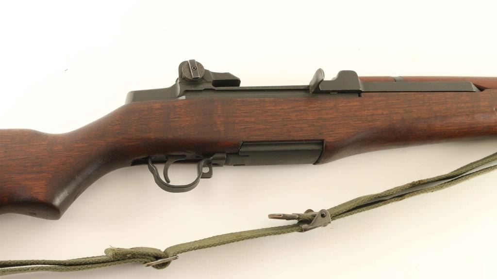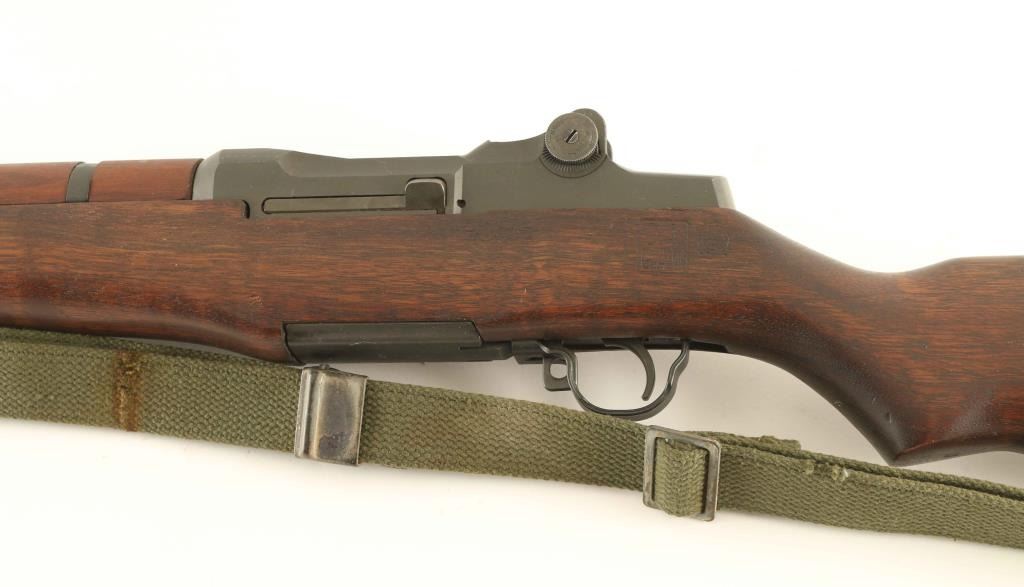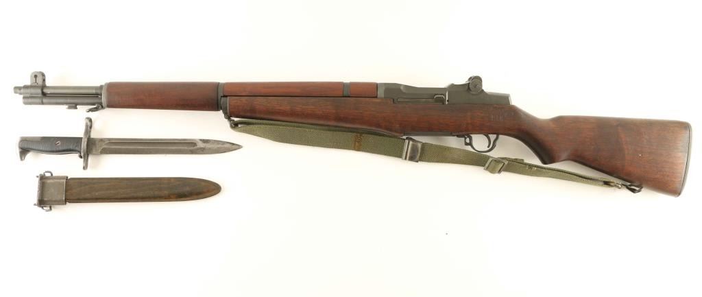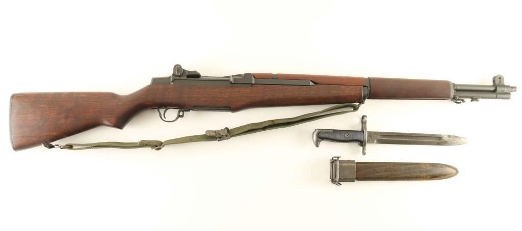 Unissued WWII era U.S. Military contact clip-fed semi-automatic service rifle chambered in .30-06 Springfield, manufactured circa 1945. Features a parkerized finish, 24" barrel marked "1-S-A-3-45", shrouded blade front sight, adjustable rear aperture sight with lock bar adjustment on the right knob, M1905E1 bayonet with scabbard, stacking swivel, smooth trigger, stamped trigger guard, manual safety, green canvas sling, smooth walnut handguard and pistol grip shoulder stock with trapdoor metal buttplate. The stock is marked with a "P" inside a circle, small crossed cannons on the grip cap, large crossed cannons and a "S.A./G.A.W." cartouche. All observed components are SA marked. Rifle retains approximately 96% of it's original finish showing wear & some light surface rust on the buttplate with little wear observed elsewhere. Action is smooth, the bore is pristine, and the wood stocks are fine with only minor imperfections. Condition is near NRA Excellent. ***C&R Firearm***