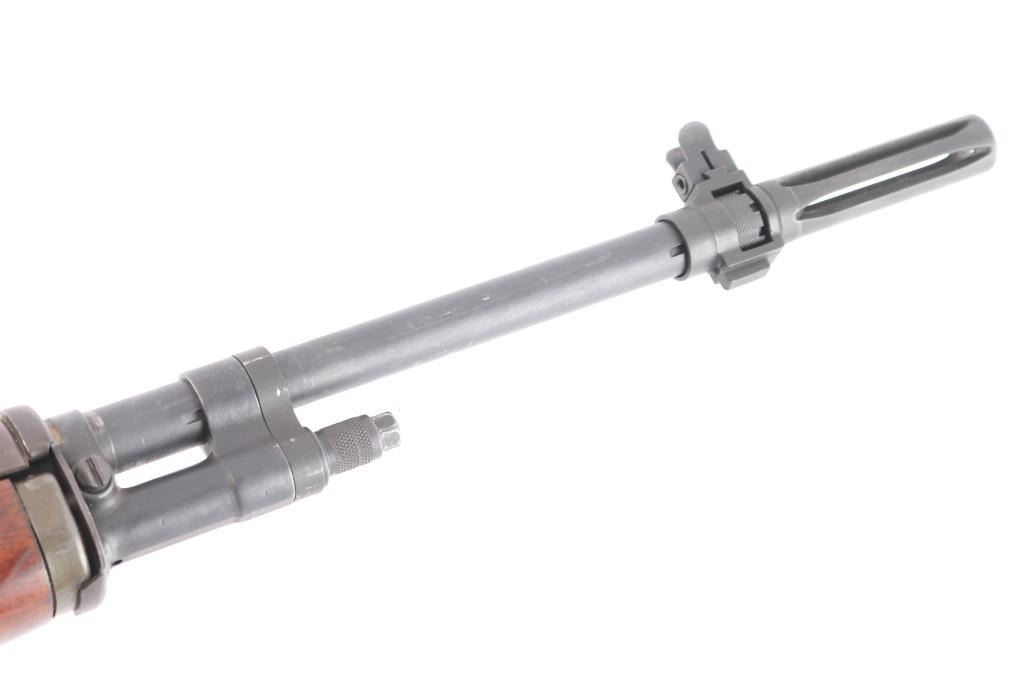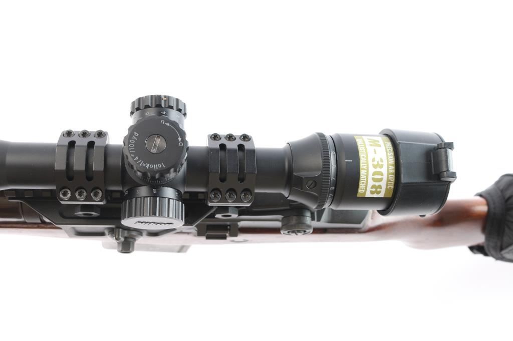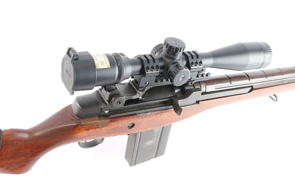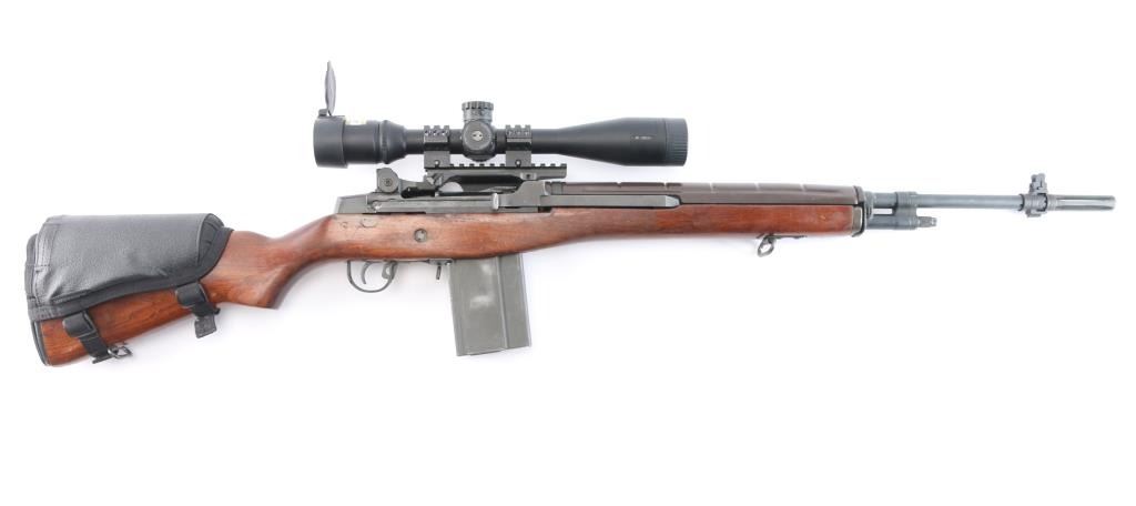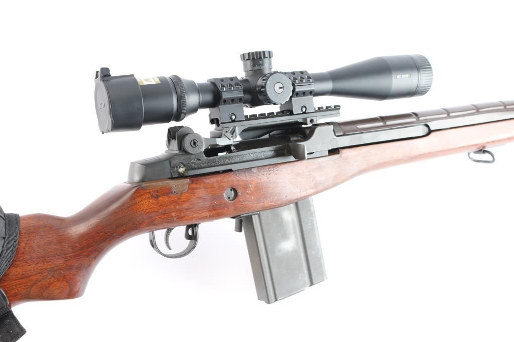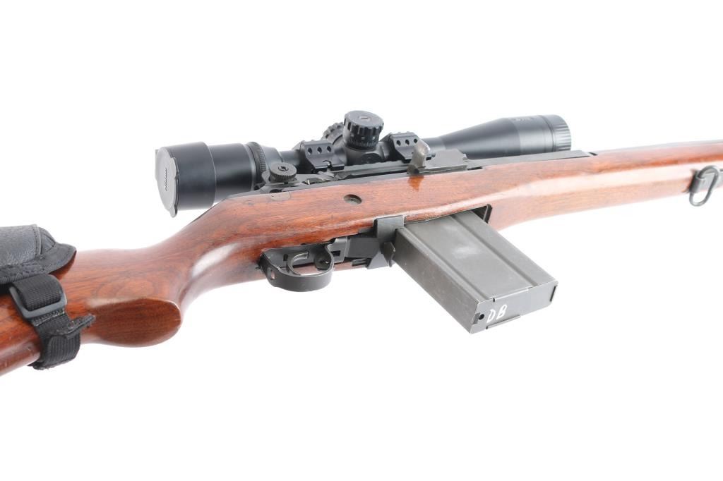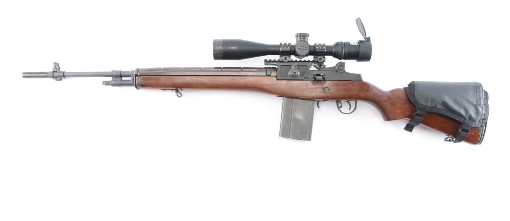 Semiautomatic rifle features parkerized finish, walnut stock with butt trap, brown fiberglass handguard, 22" barrel, , bayonet lug,flash hider, blade front sight with protective ears, adjustable rear peep sight, sling swivels, manual safety, stripper clip guide on receiver, accepts detachable magazines. Buttplate has hinged cover over trap door. Mounted with a Nikon M-308 4-16X42 scope BDC reticle on a ADLAK Industries base, clear optics, black nylon buttstock cheek iece attached. Bore is excellent/bright. Retains 96% metal finish, with minor scratches and scuffs. Stock is excellent condition with handling marks. Fiberglass handguard is excellent condition. Includes (1) 20 rd magazine.
