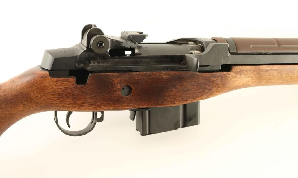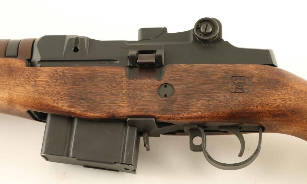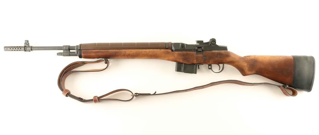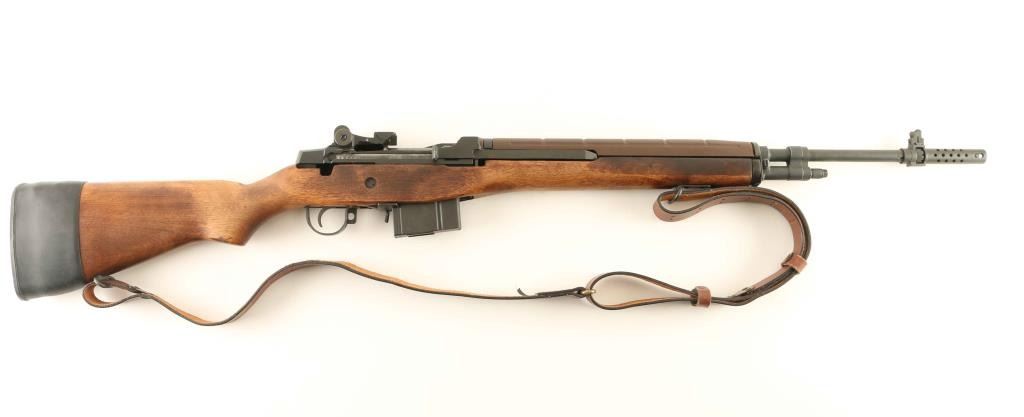 Semi automatic variant of the M14 battle rifle chambered in 7.62x51mm Nato, manufactured circa 2003. Features a matte blued finish, 22" barrel marked "H-R7790190 9-62", attached muzzle break, shrouded .062" NM blade front sight, adjustable aperture rear sight, smooth trigger, manual safety, 10 round magazine, installed stripper clip guide on the receiver, adjustable gas system, smooth brown leather sling, brown composite handguard and pistol grip shoulder stock with cut-out for a selector, Department of Defense acceptance proof, & slip on "US B200968" recoil pad. Rifle exhibits approximately 95% of it's original finish showing slide wear on the bolt & receiver with little wear observed elsewhere. Action is smooth, the bore is pristine, and the wood sock is fine. Condition is near NRA Excellent. ***Modern Firearm***