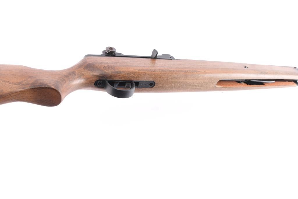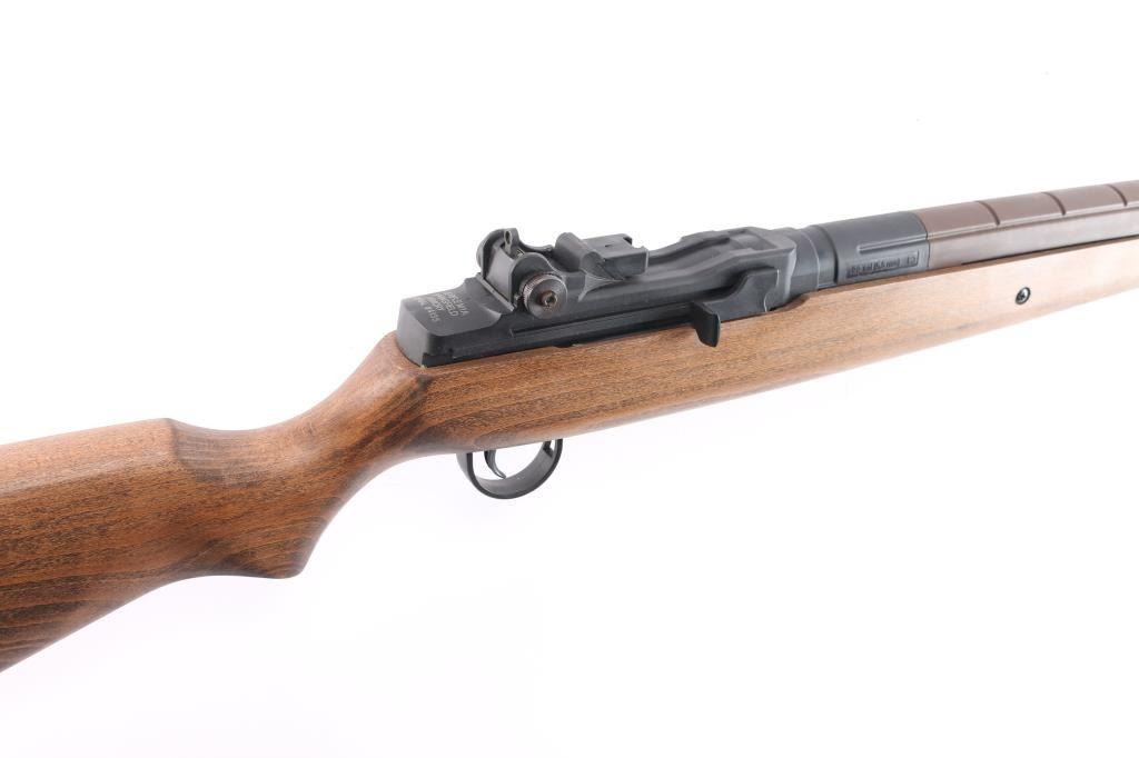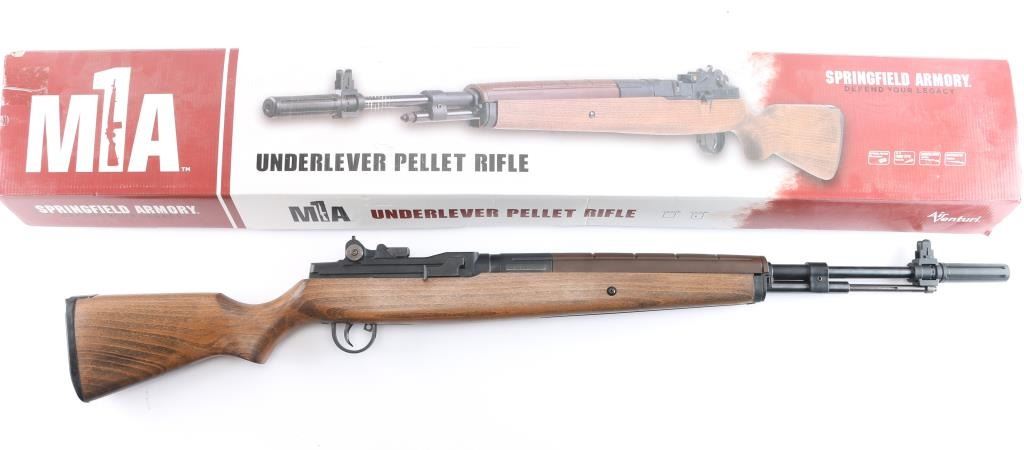 Springfield M1A .22 Cal. pellet rifle in .22 Cal. 1000 FPS, underlever Spring-Piston, Single Shot action, windage/Elevation Adjustable, wood stock with polymer handguard. Rifled barrel, safety in the triggerguard, faux muzzle break. Rifle is in like new condition. Comes in original factory box with label.