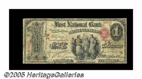 <B>Springfield, MA</B></I> - $1 Original Fr. 380 <B>The First NB</B></I> Ch. # 14<BR>A very scarce low charter bank which issued First Charters and Brown Backs only before liquidating in 1906. Evenly circulated <B>Fine.</B></I>