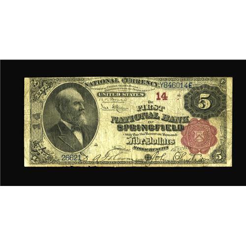<B>Springfield, MA</B></I> - $5 1882 Brown Back Fr. 466 <B>The First NB</B></I> Ch. # 14<BR>A nice Brown Back from this scarcer low charter bank. <B>Fine,</B></I> with just a tiny bit of bleed through onto the back from the seal and charter number.<BR><BR><b>Shipping:</b> Coins & Currency (<a target="_blank" href="http://www.heritageauctions.com/common/shipping.php">view shipping information</a>)