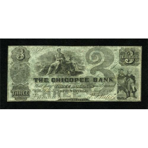 <B>Springfield, MA- Chicopee Bank</B></I> $3 May 1, 1862<BR> This spurious note imitates a rough verbal description of a genuine note on this bank. Genuine or spurious, this is the first note we have had on this bank. <B>Crisp Uncirculated.</B></I><BR><BR><b>Shipping:</b> Coins & Currency (<a target="_blank" href="http://www.heritageauctions.com/common/shipping.php">view shipping information</a>)
