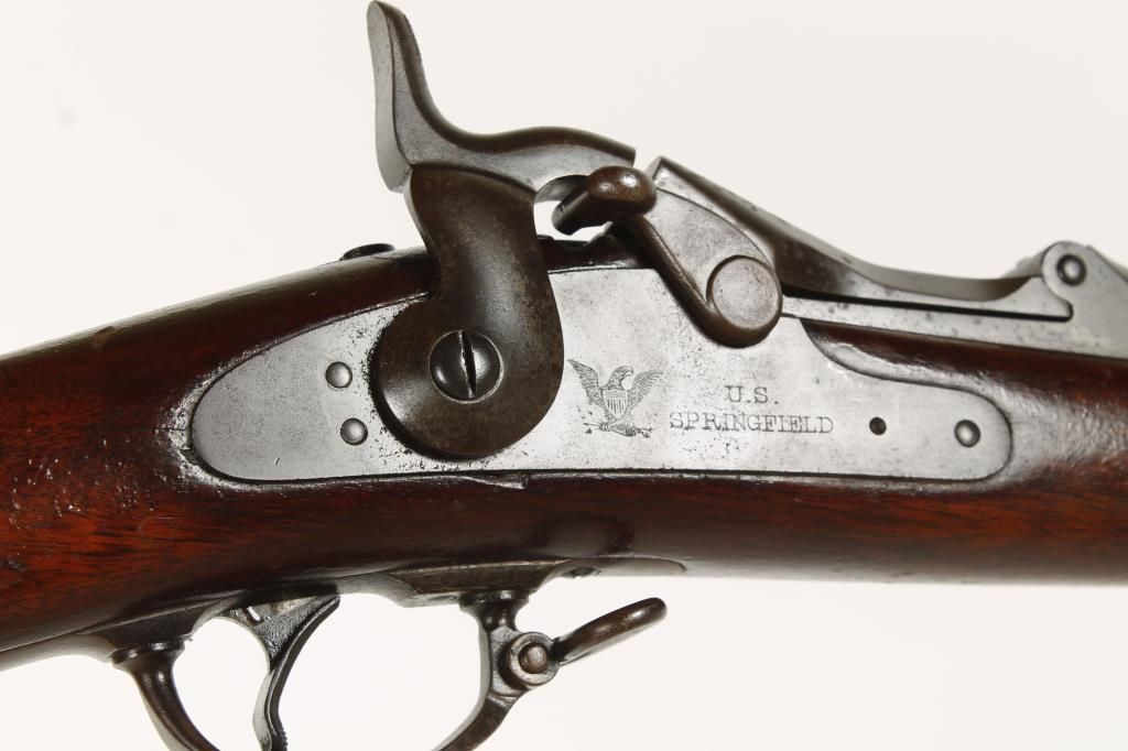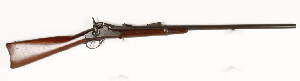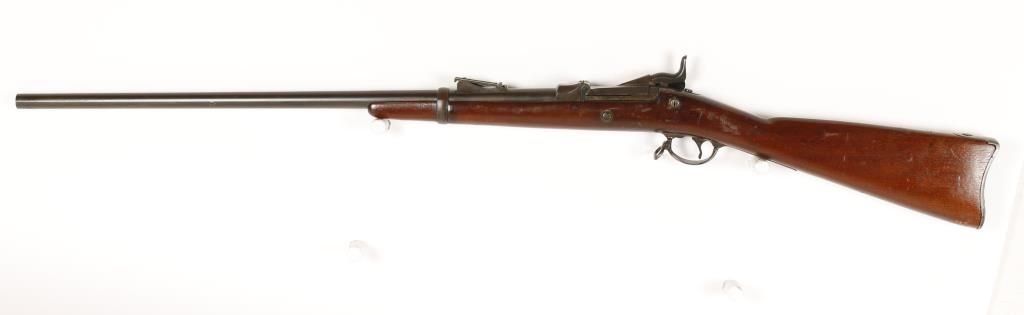 Trapdoor breechloading rifle with barrel being cut down to about 27". straight grip wood stock has been cut down as well with 1 barrel band. Maintains original rear sight and no front sight. Good bore and action. Condition: Good overall showing light pitting and dark patina. *Antique Firearm*