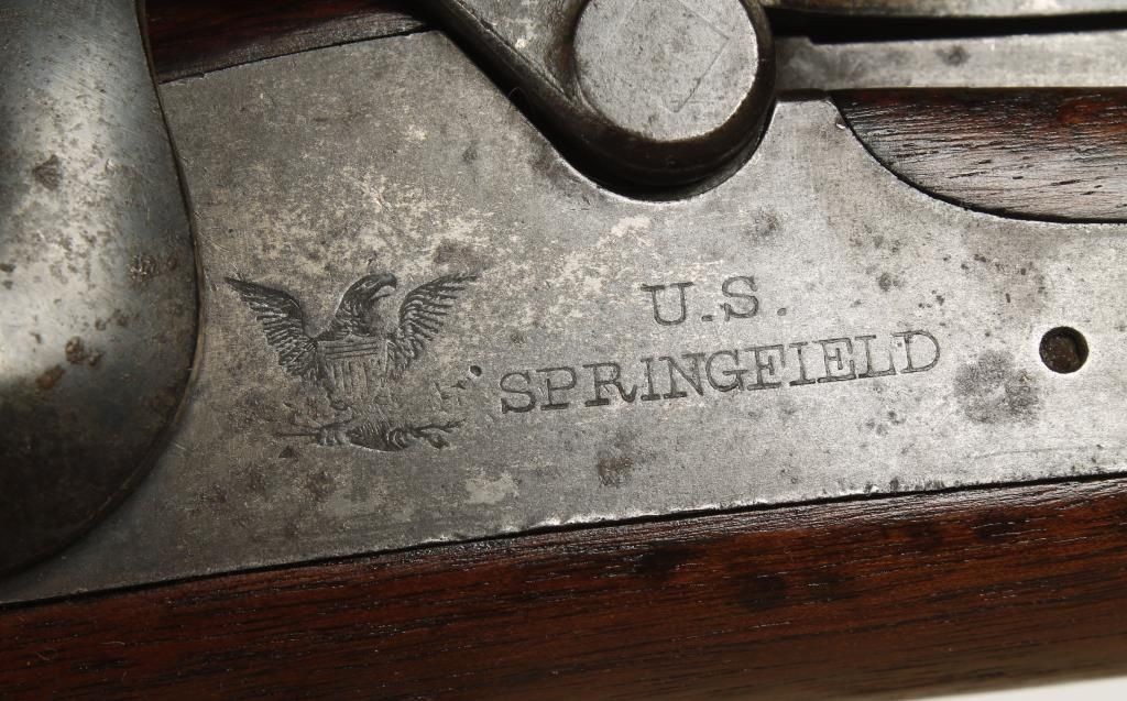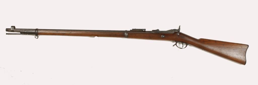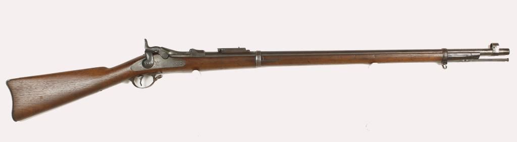 Trapdoor. Not marked for caliber. 32-5/8" barrel with a good bore and visible rifling. All metal is blued steel. Buttplate is marked "US" and the barrel bands are marked with a "U". Rear sight is adjustable for windage and elevation. The front sight is hooded. Ramrod is present showing some bluing loss as is most of the metal. The buttplate has a rough and rusty appearance. There are a few patches of surface rust on the barrel and the breechblock with discoloration and fading to the rest of the steel. The wood has shrunk a little below the adjacent steel surfaces in places but is otherwise in good condition. Condition is good-very good for antique.
