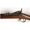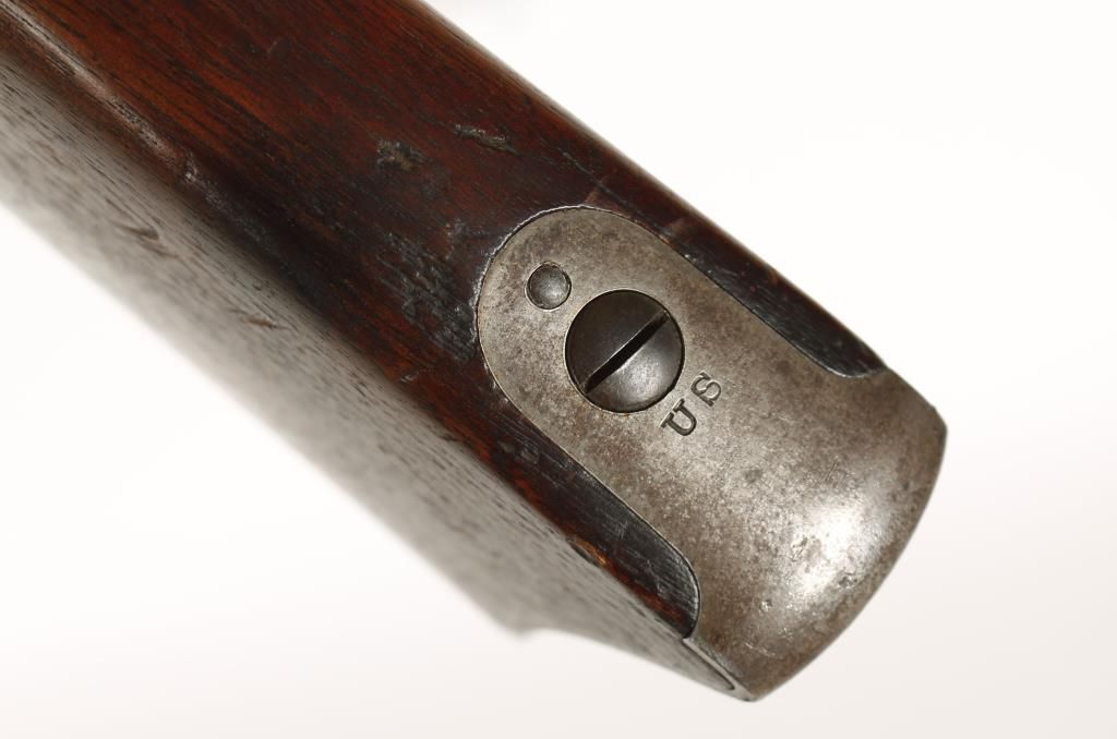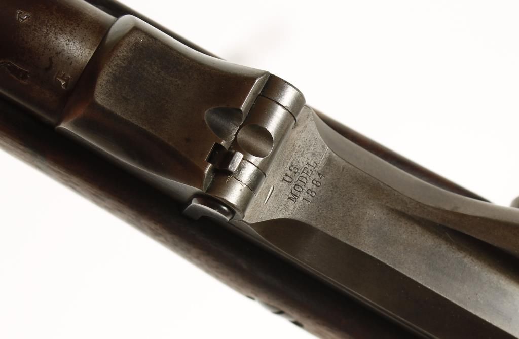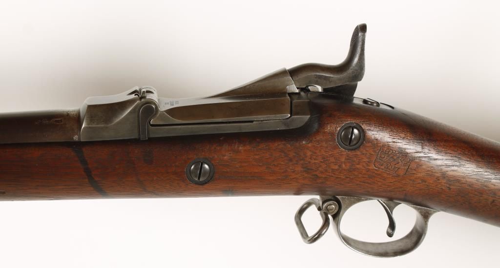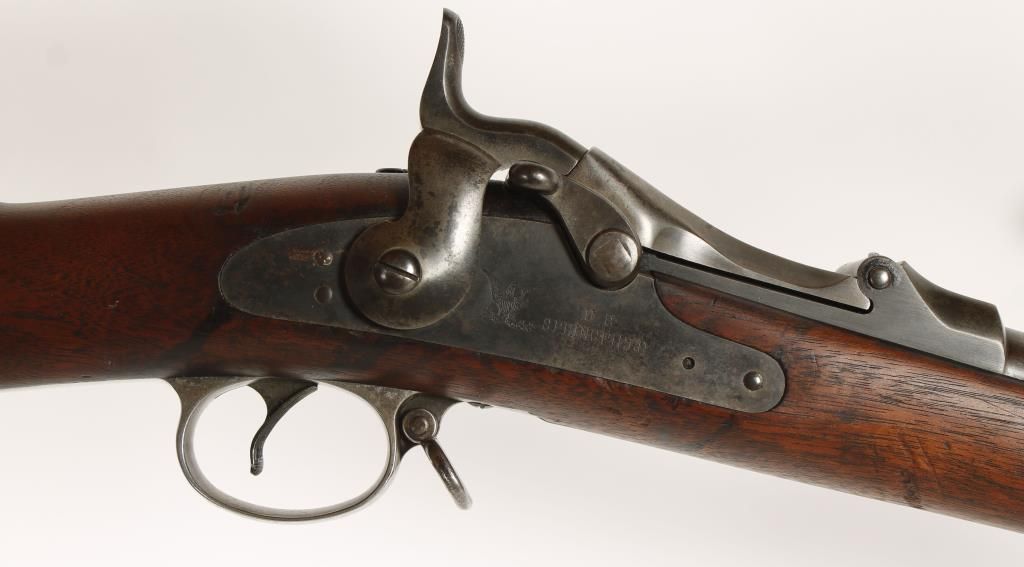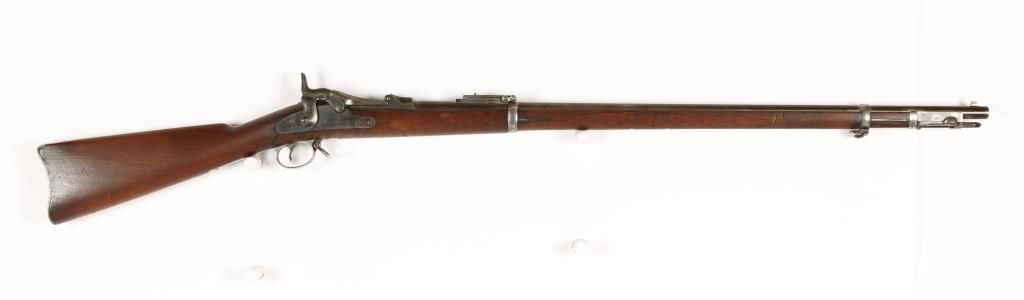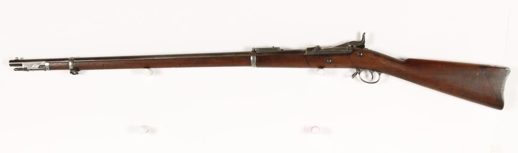 Single shot Trapdoor breech loading rifle with 32-3/4" barrel with 2 barrel bands. Plain straight grip full length walnut stock and Buffington rear sight. Shows good cartouche on left side of stock dated 1891. Good bore and good working action. Condition: Very good overall showing traces of case coloring and nice patina. *Antique Firearm*