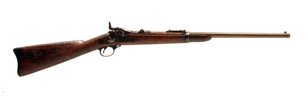 Springfield Mdl 1884 Cal .45-70 SN:54562 Post Civil War single shot trapdoor carbine (or could be cut down rifle). Blued finish, heavily used smooth stock and fore arm, 22" barrel shows some rust accumulation but may clean. Condition: Well used but still intact and could clean up to a nice collectable. Saddle ring still attached.