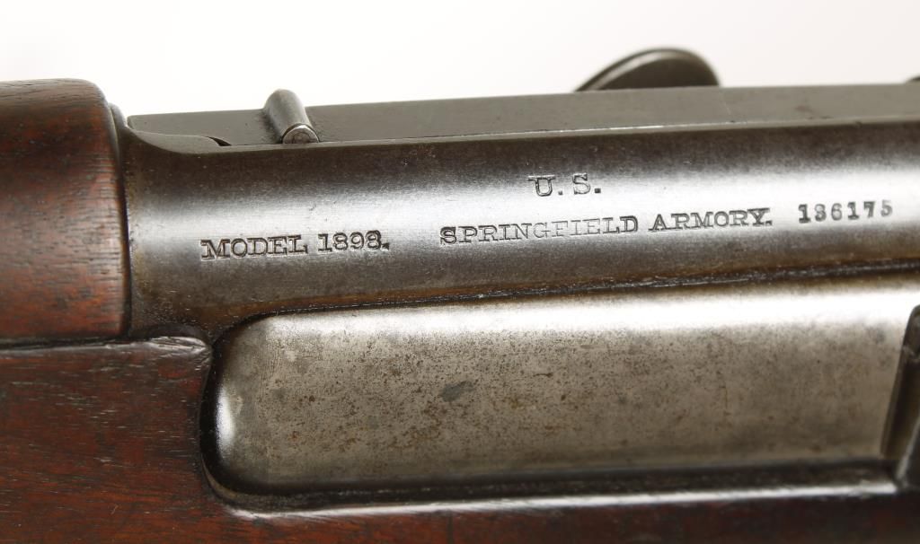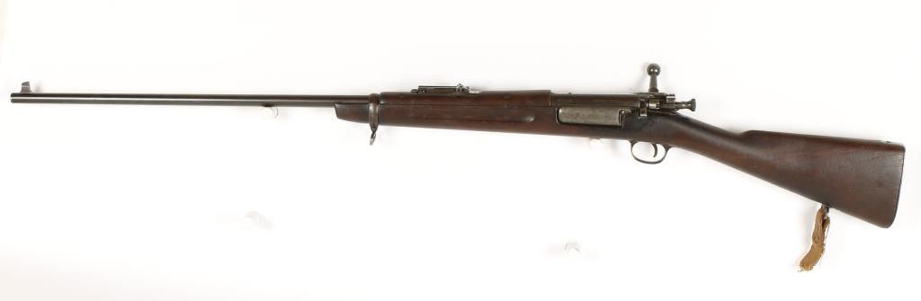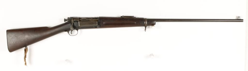 Military bolt action rifle made in 1898 with 30" barrel. Straight grip wood stock which has been cut down. Upper wood handguard. Maintains original sights. Fair bore and good action. Condition: Fair to good showing light pitting scattered throughout. *Antique Firearm*