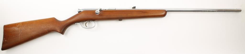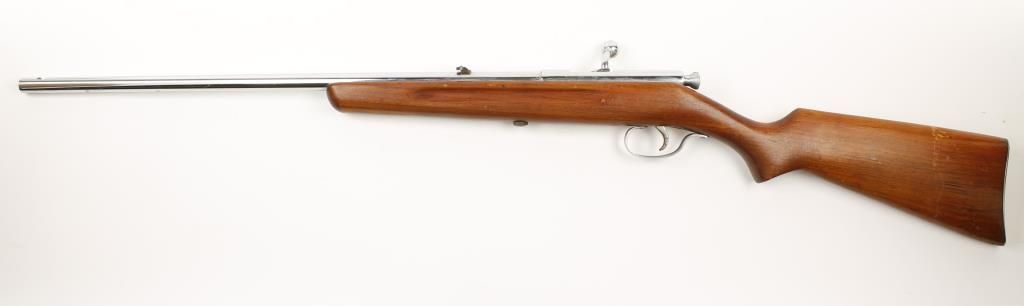 Single shot bolt action rimfire rifle with 22" barrel. Nickel finish, plain semi pistol grip wood stock, metal butt plate, no front sight and folding rear leaf sight. Good bore and action. Condition: Good showing scratching in finish and wood is fair to good.