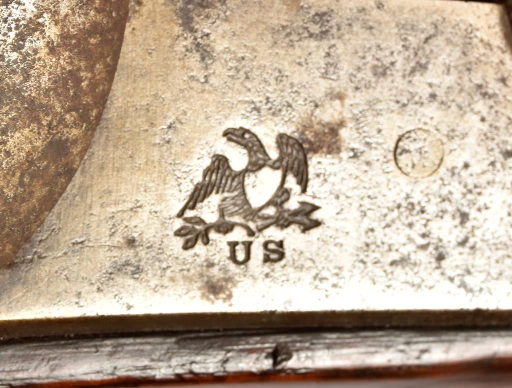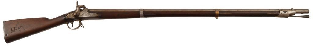 NVSN. .69 caliber, 42 inch barrel, Springfield Model 1842. Metal in the white, 1-piece walnut stock with "J.A.M." carved into it. Missing front sling loop, correct markings, circa 1849. Metal silver grey overall with some pin prick oxidation, very good wood, mechanically excellent.