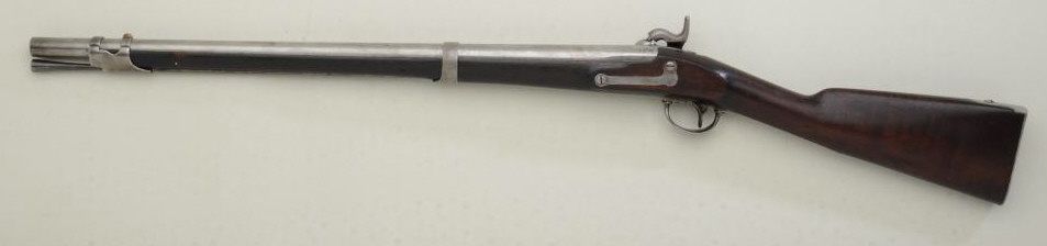 Springfield Model 1847, .69 cal. Musketoon Naval Model with its distinguishable front band, refer Fladerman, 9A-300. The gun remains in original good to very good condition showing a light gray patina finish, scattered erosion and pinprick pitting which is all minor; good sharp markings and eagle fully defined at center of lock plate. The stock is very good with 75% visible cartouche, original trumpet shaped ramrod,generally very good overall; a couple small losses along ramrod channel and one chip and loss at top edge of forend between the bands. A 7.5 to 8 on 1 to 10 scale and rarely encountered. Est.: $3,000-$6,000