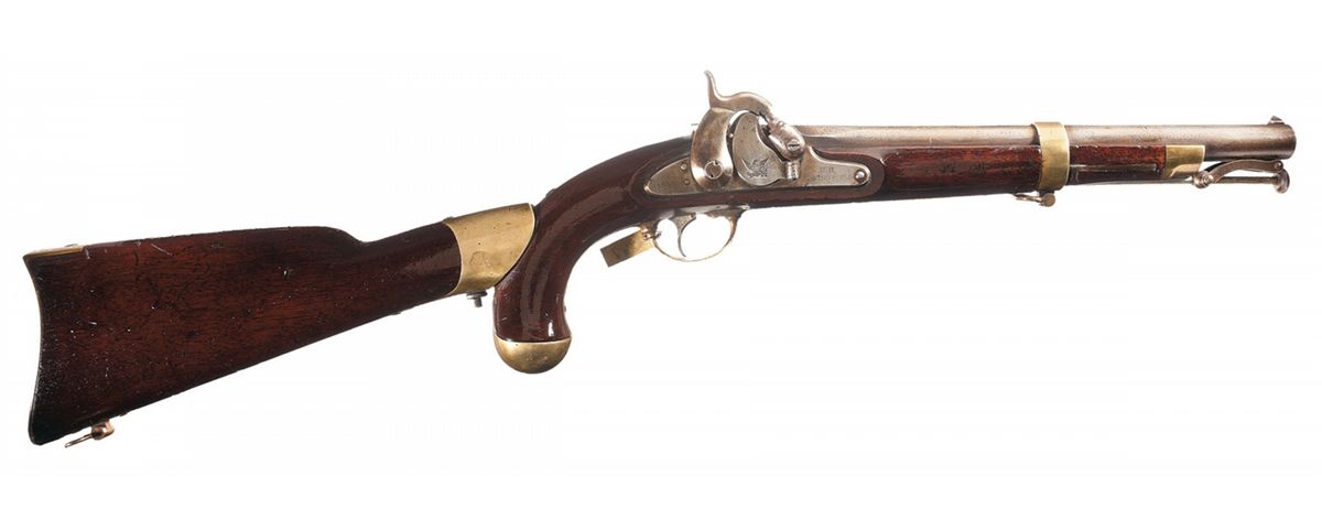 U.S. Manufactured in 1855, (with both barrel and lock plate corresponding). This unique weapon features an attachable stock, Maynard tape-lock primer, bolster with clean-out screw, three-leaf rear sight graduated to 400 yards and swivel ramrod with button tip. The forearm cap, barrel band, trigger guard, attachable stock yoke, sling swivel mount and buttplate are brass. The metal parts are bright. The pistol stock and attachable stock are oil-finished black walnut. The lock plate is dated "1855" behind the hammer and marked "U.S./SPRINGFIELD" ahead of the bolster. The Springfield Eagle and Shield motif is marked on the primer magazine door. The barrel tang is dated "1855". "V/P/Eagle head" proof and inspection marks are stamped on the left barrel flat. The buttcap is stamped with the batch number "9" and the stock yoke is numbered "13". "U.S." is stamped on the heel of the buttplate. Springfield Armory manufactured 4,021 Model 1855 Pistol Carbines between 1855 and 1857. The Pistol Carbines were intended to provide the Cavalry and Dragoons with a portable rifled carbine that could be used on horseback as a pistol with the stock removed. Model 1855 Pistol Carbines were widely issued on the frontier before the Civil War and remained in service early in the Civil War until they were replaced with breech-loading carbines. The Model 1855 Pistol Carbine is one of only three handguns ever manufactured by the Springfield Armory.