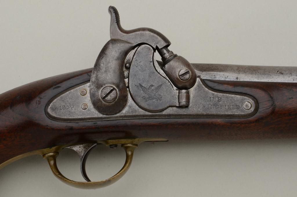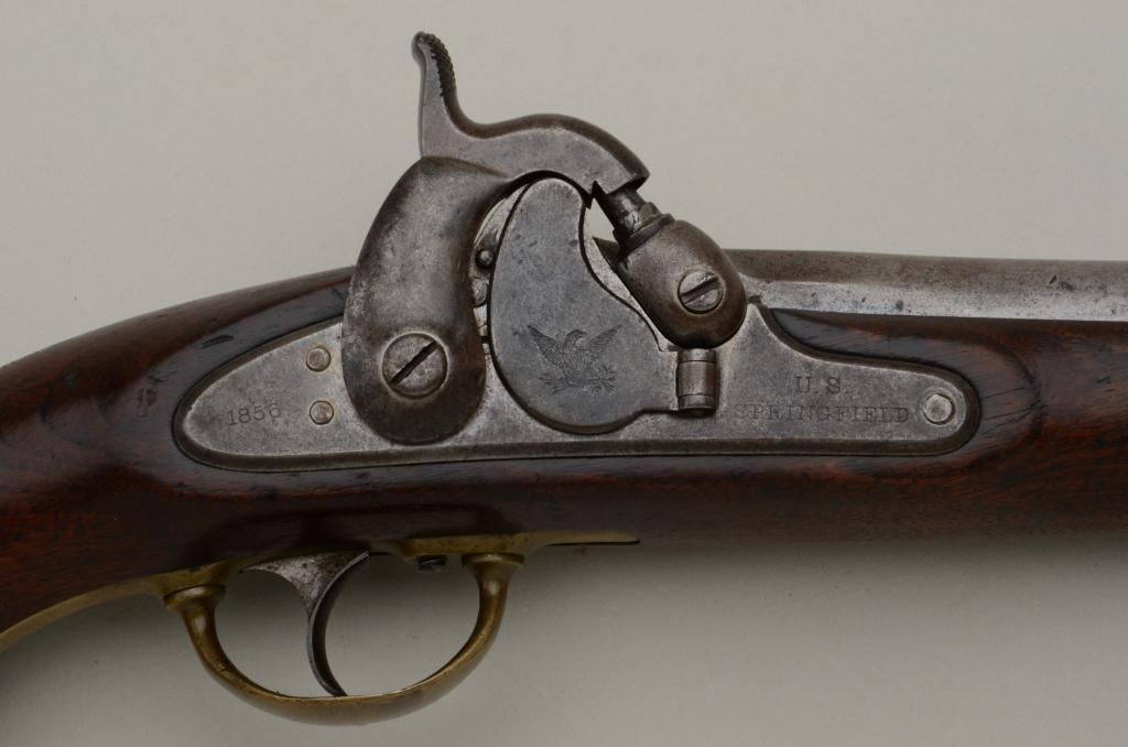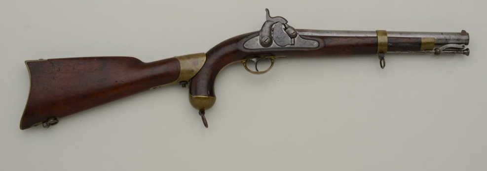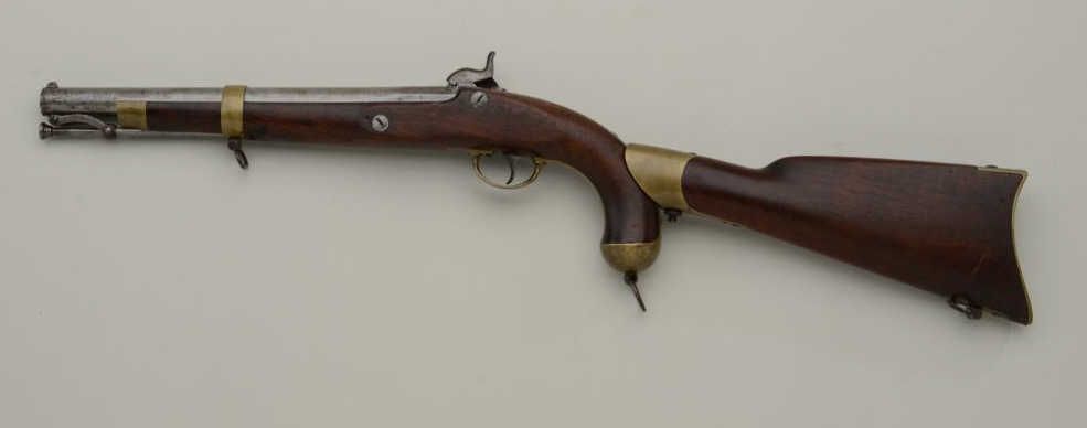 Springfield Model 1855 pistol carbine with original shoulder stock, .58 caliber, 12” round barrel remaining in good to very good original condition. The metal surfaces show a light gray patina finish with some minorscattered pitting and erosion. The Springfield Eagle on primer door is fully visible and fairly crisp, the lock markings are very good and the rear of the lock shows the date of 1856. The tang area shows 1855and the left side of the breech shows a clear VP and Eagle proof. The wood is good to very good with a couple of small losses, one large chip from left side of stock near band and no visible cartouche. The stock is marked US on the butt plate and is serial numbered 3 which is an assembly or batch number. The stock shows some dings and mars and is at least very good. The stock matches the condition of the pistol well. The ramrod andthe small parts are all original. The rear sight is original. The pistol cocks and operates well. A strong 7+ on 1 to 10 scale. Est.: $3,000-$6,000.