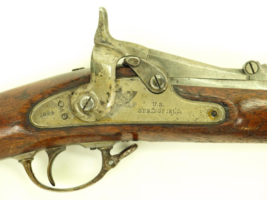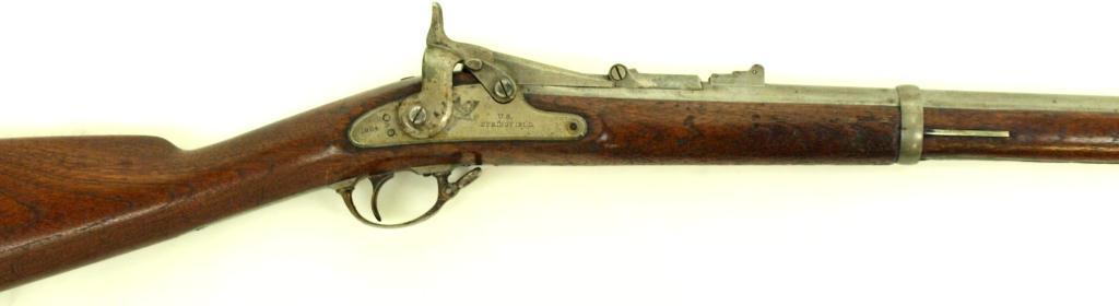 Allin Conversion with only 25,000 altered using Model 1863 muskets, 40" barrel and full walnut stock. Markings include US SPRINGFIELD 1864 with eagle to right side lock, top of breech block marked 1866. Shows good overall condition with replacement ramrod, visible cartouche to left side of revarnished stock, sling swivels intact. NO FFL required. Ref. Flaydermans 9A-356 pg.473