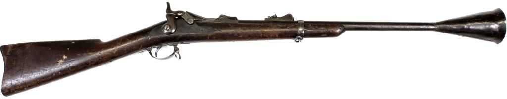 movie prop gun stamped Vita on barrel. Old tag reads Used by Vitagraph in 1912 "Custers Last Stand" by Warner Bros as Blunderbuss John Wayne film The Big Trail 1930. Barrel shows rental company added cone, further stamped WB18460 with visible cartouche on left side of stock, bottom with P in circle behind bottom tang. Action and bore good. Antique. Deserves further research. Est. 1500-2500