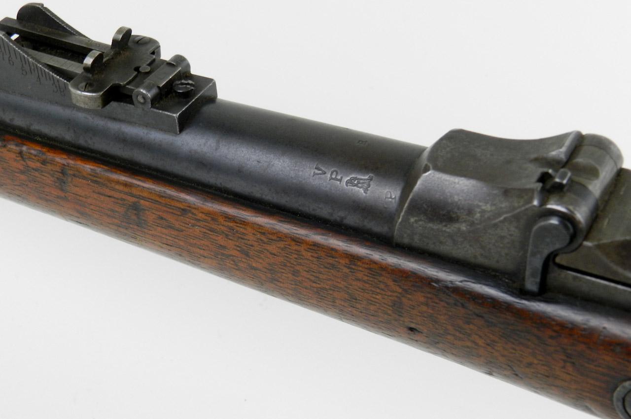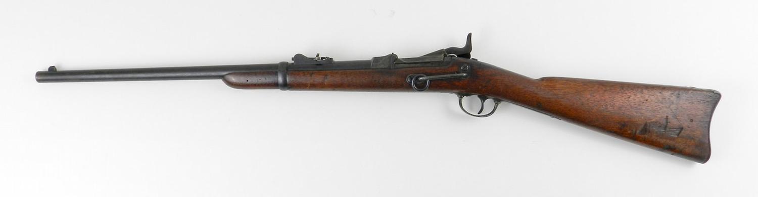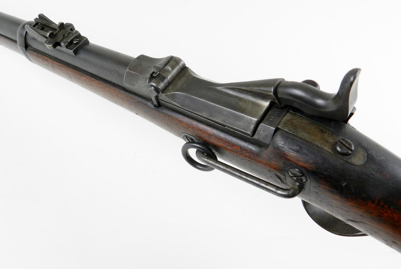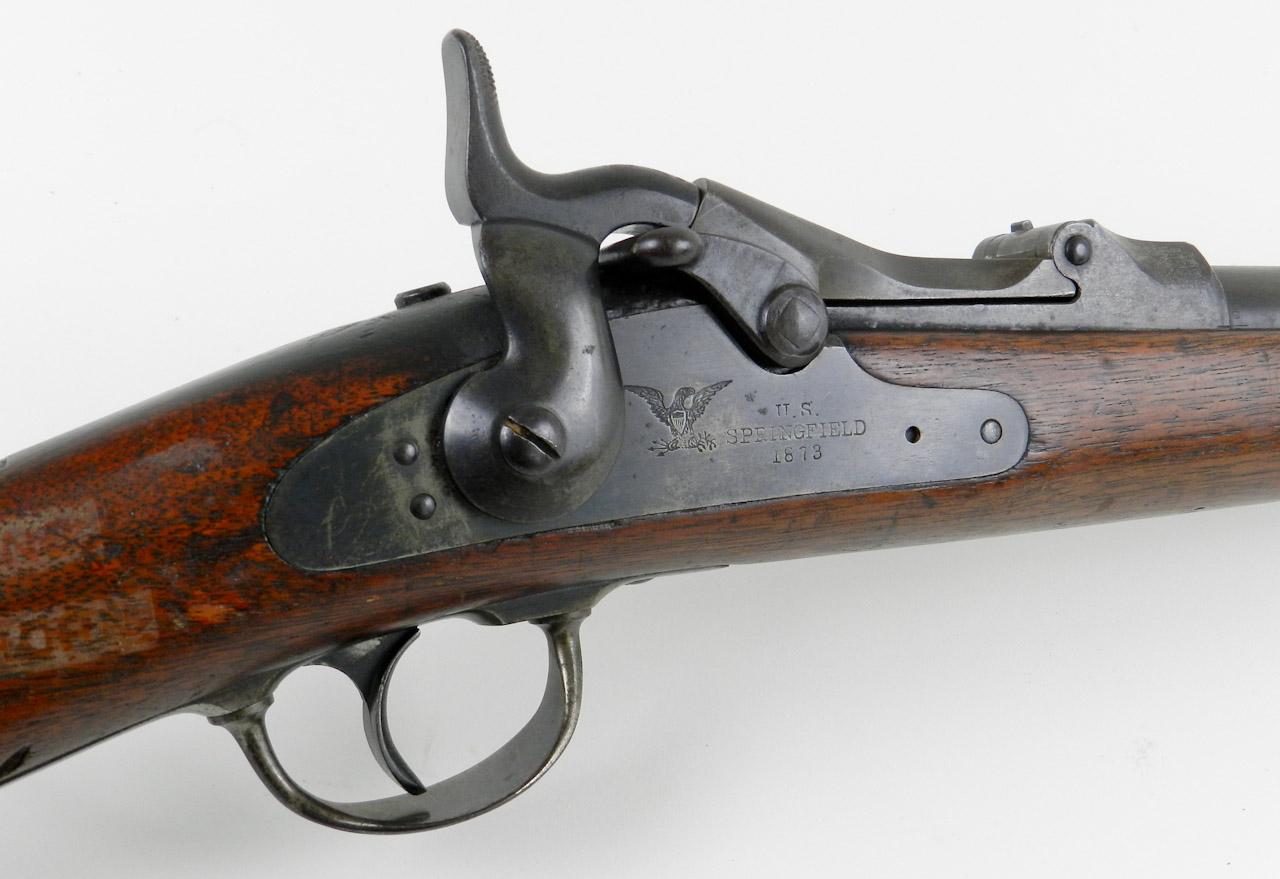 Springfield Model 1873 Trapdoor Carbine, #413468, .45-70 cal., 22'' barrel, blue and case-hardened finish, smooth walnut stock. Condition is very good retaining approx. 70% arsenal blue to barrel. Case colors to breechblock have toned but remain vivid on interior. Blue sideplate is marked with ''(Federal eagle)/U.S./Springfield/1873''. Breechblock is marked ''U.S./Model/1873''. Stock appears unsanded with minor gouges, scratches and dings, as well as residue from a previously affixed label. Action is good, bore is fine and should clean to better. A nice example of an Indian Wars Carbine. Est.: $1,800-$2,500.