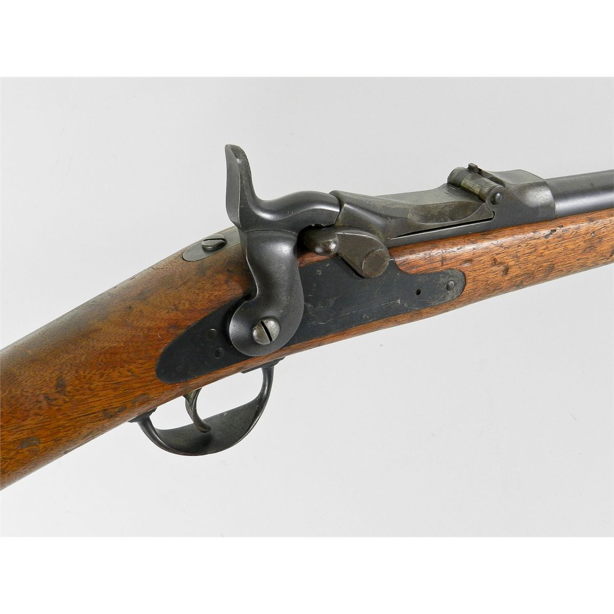 Model 1873 Trapdoor Carbine, by Springfield, #176919*, .45-70 cal., 22'' barrel, blue barrel, frame, sideplate, hammer and triggerguard; case hardened breechblock and tang, 1873 rear sight, walnut stock with 1881 cartouche, butt with trap and cleaning rod compartment. Condition is overall very good to near fine retaining approx. 85%-90% thinning and toning finish. Stock with just moderate dings, scuffs and scratches, with 60%-70% cartouche, ''P'' proof, and inverted ''S'' stamped to cheekpiece area of stock. Action functions as designed, bore is very good to fine. Model 1873 Trapdoor Carbines are considered somewhat scarce, as roughly 20,000 were mfg'd. Est.: $1,500-$2,000.