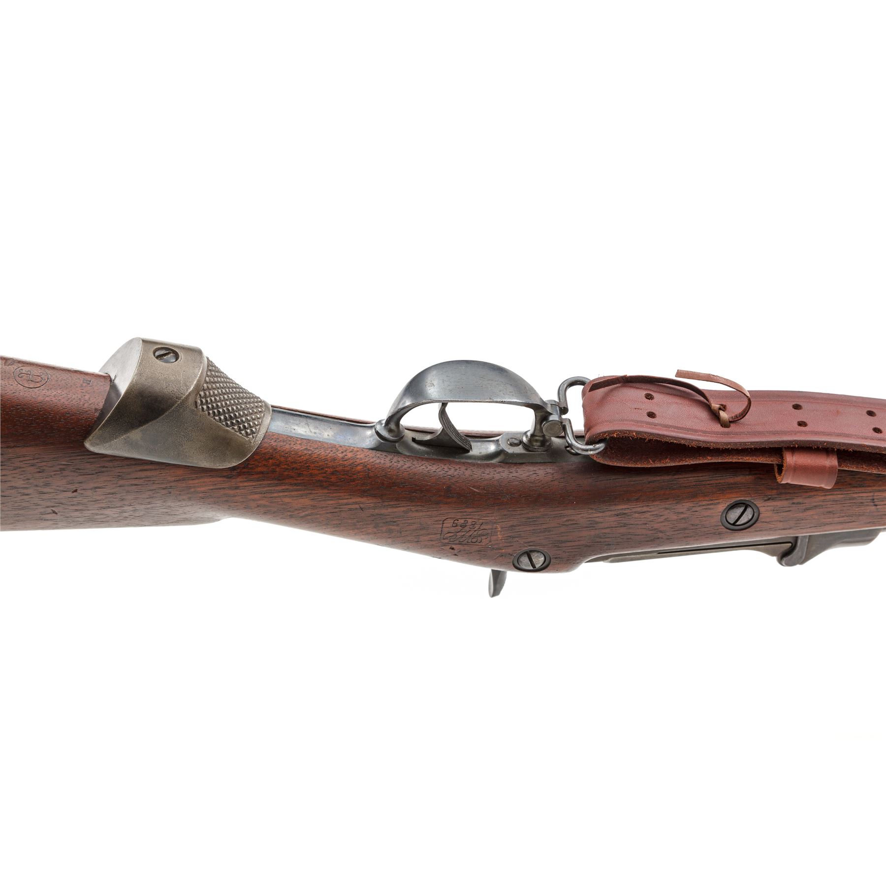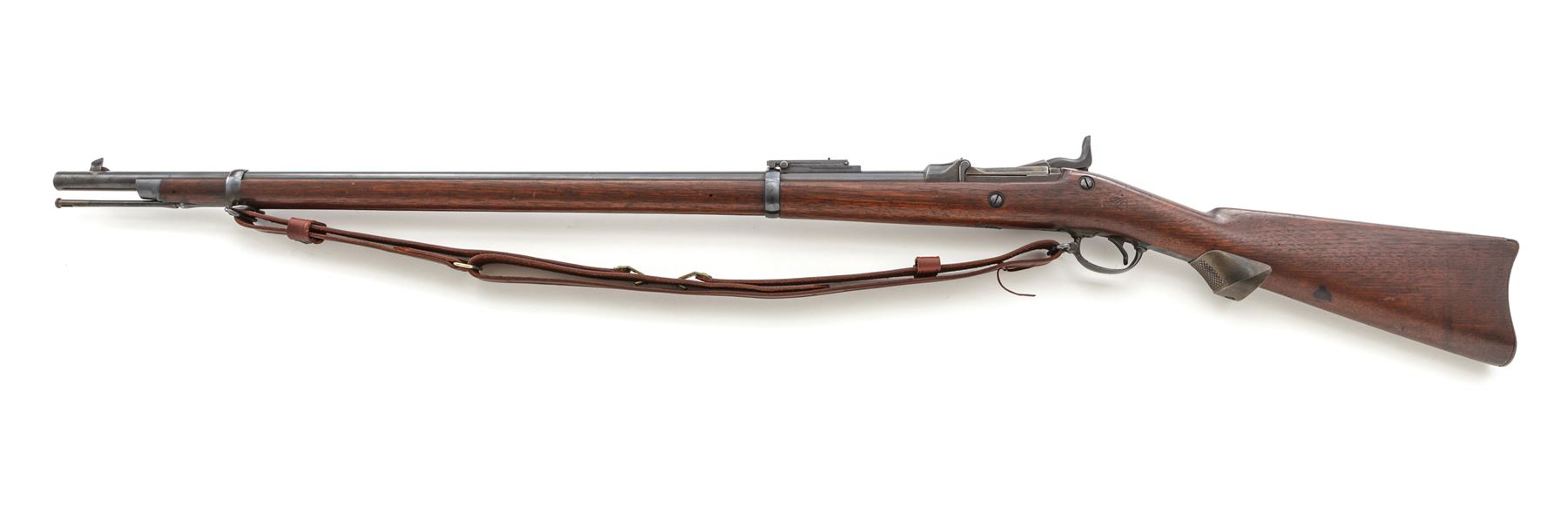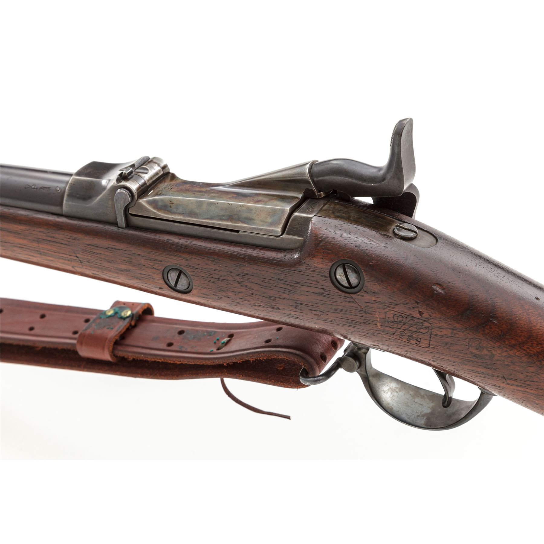 U.S. Springfield Model 1873 Trapdoor Infantry Rifle, with 1877 improvements and leather sling, #455746, .45-70 Gov't CF cal., 32-5/8'' round barrel with block-blade front sight and Buffington rear sight (correctly marked ''R'' for Rifle) marked ''V/P/(eaglehead)/P'' and ''A'' at breech; trapdoor breechblock is correctly marked ''U.S./Model/1873'' in three lines at hinge; flush-mounted lockplate with a spread-wing eagle clutching olive branches and ''US/Springfield'' ahead of hammer; correct two-piece triggerguard with sling swivel at front; steel furniture including two spring-retained barrel bands (top band with stacking swivel), buttplate marked ''US'' at tang screw, one-piece ramrod with button tip; period-correct checkered iron pistol grip added behind triggerguard tang.  Oil-stained walnut fullstock with ''SWP/1889'' (armory inspector Samuel W. Porter) rectangular cartouche on left side, encircled ''P'' proof and ''B'' behind pistol grip.  Mfg'd ca. 1889-93.  Condition is fine and all original, with sharp edges and markings, the barrel retaining a smooth deep military blue finish with cleaned erosion at top of muzzle; the lockplate, triggerguard, nose cap, barrel bands and springs with deep glossy blue, breechblock and tang showing lovely case colors, buttplate showing blue amid light scattered discoloration, pistol-grip gunmetal gray.  Stock is solid and smooth with sharp edges, only minor marks, fits ''proud'' and has the correct reddish color.  Action is strong and smooth; bore is bright with deep rifling.  Russet leather sling is a well-made modern reproduction.  Est.:  $600-$900.  (Antique)