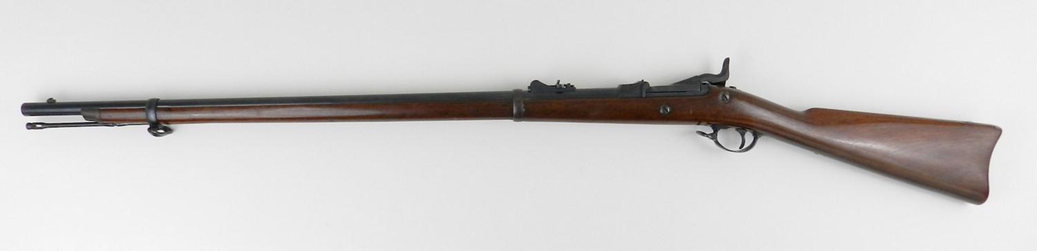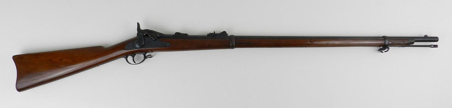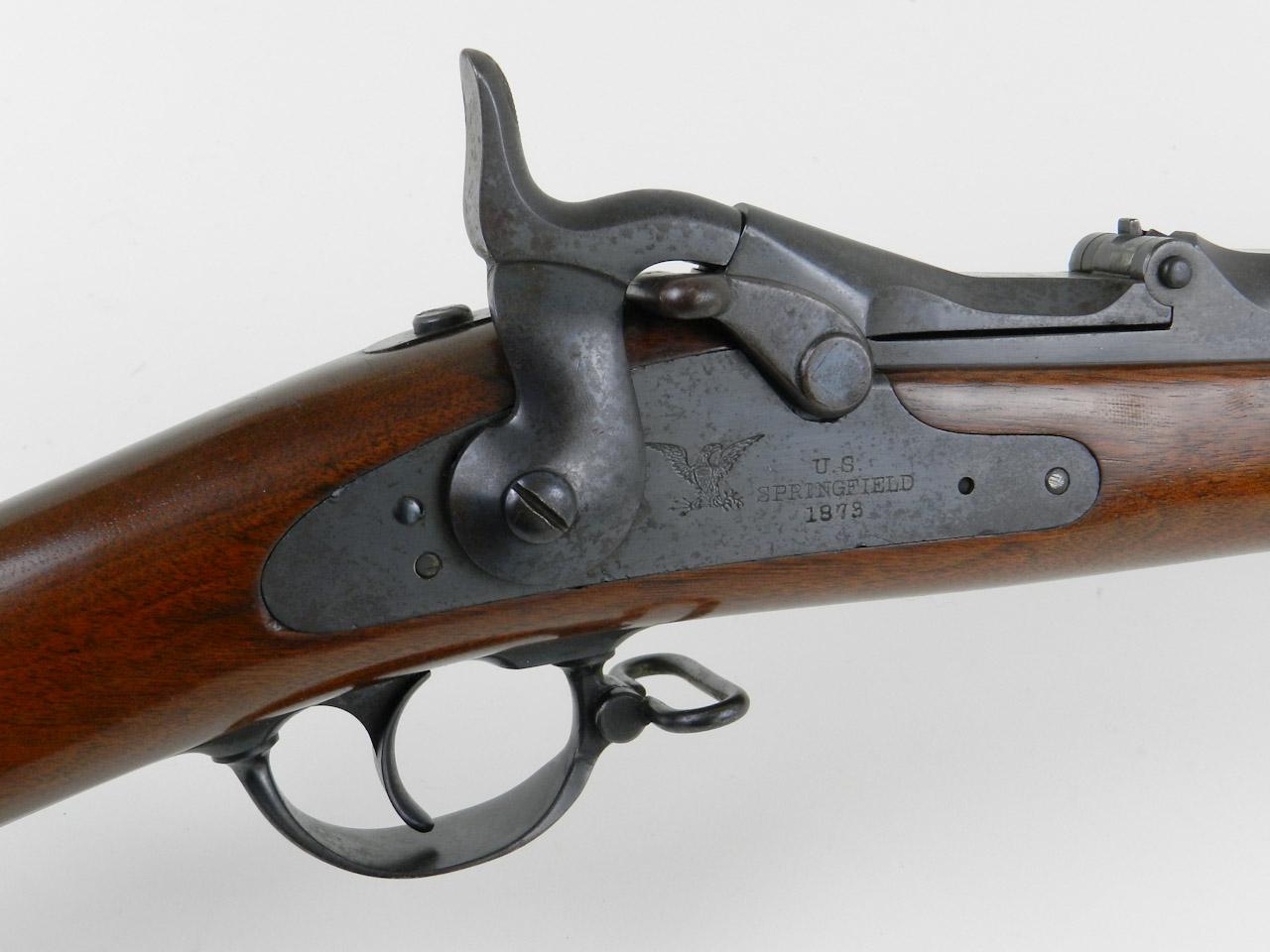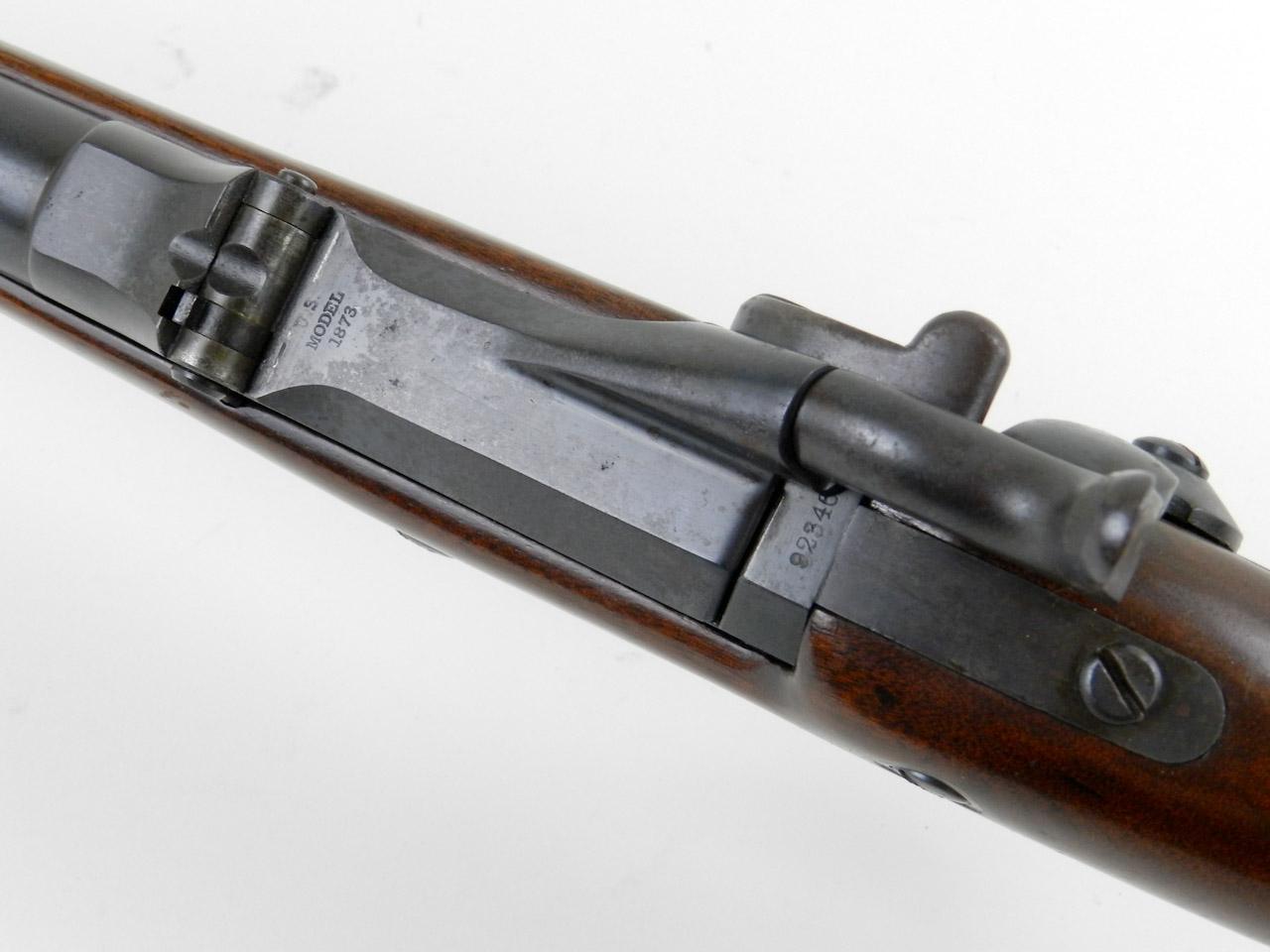 Springfield Model 1873 Trapdoor Rifle, #92346, .45-70 cal., 32-5/8'' barrel, blue finish, cartouched walnut stock, sideplate and breechblock dated 1873. Early ramrod is present. Condition is fine retaining approx. 92%+ arsenal blue to barrel, light to moderate pitting near hammerspur, minor discoloration to sideplate. Cartouche is faint but visible; stock has been later varnished. Early iron firing pin is intact. Bore is good to very good with light erosion in grooves. Est.: $500-$750.
