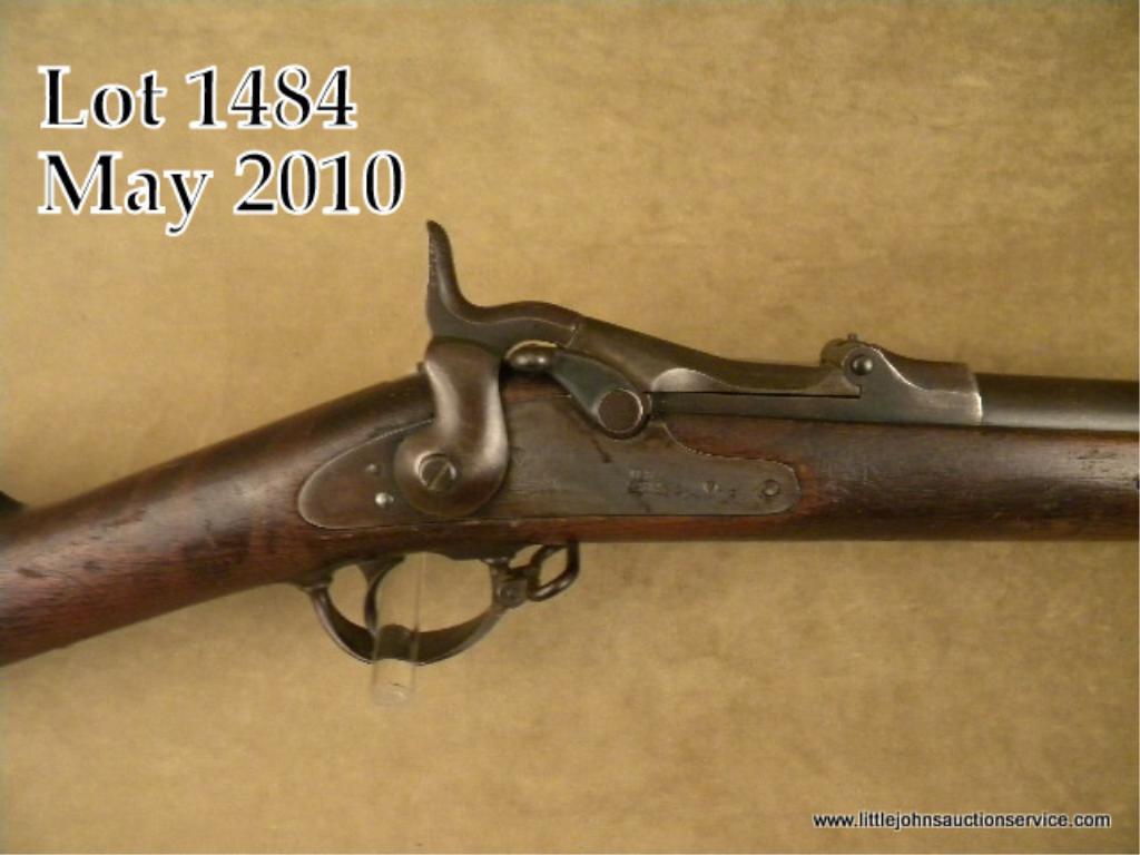 Springfield Model 1873 Trapdoor military rifle, 45-70 cal., 32” round barrel, blue finish, sling swivels, iron ramrod, wood stock, #32361. This gun is in overall good condition showing a plum brown patina on the barrel and light grey lock platewith spread eagle and interesting “U.S. 1884” marking that is not standard with this rifle and may be a later replacement; good action, bore and markings, high arch trapdoor; overall good wood with scattered nicks, mars and scratches fromcarry and storage; circle “P” and “RS” cartouches. Est.: $200-$400.