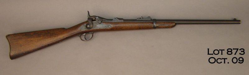 Springfield Model 1873 trapdoor carbine, 45-70 cal., 22” barrel, wood stock, #146272. This gun is in overall good to very good condition showing an even dark brown patina to metal surfaces, good bore, action and markings, overall good wood withno visible inspector’s catouches; left stock at base stamped “C 13”. Est.: $750-$1,500.