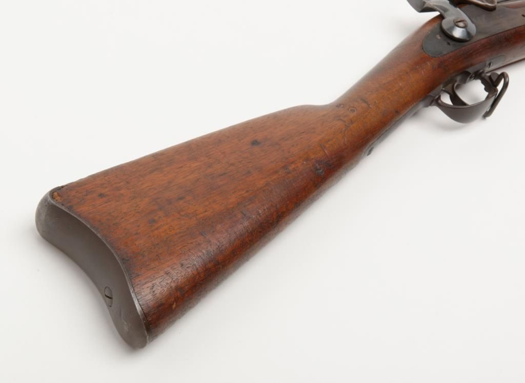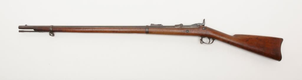 Springfield Model 1873 trapdoor rifle in .45-70 caliber, serial number 68258 made in 1876 the same year as The Custer Battle. The rifle remains in good to very good condition. The metal surfaces show 30% to 50% original blue drifting to grayishbrown with some scattered light erosion and pinprick pitting just starting. The markings on the lock are good and the Eagle is well defined. The cartouche is not visible on the stock but the āPā proof behind the trigger guard is mostlyvisible. The stock shows some dings, mars, circular impressions or designs and small losses with minor repairs to the forend. The action is good and the bore is at least good and may clean. There is a rack number 20 on the butt stamped into the wood by the butt plate. From the collection of William A. Gary consigned by his estate. Est.: $350-$700