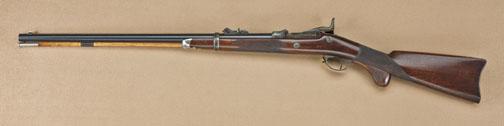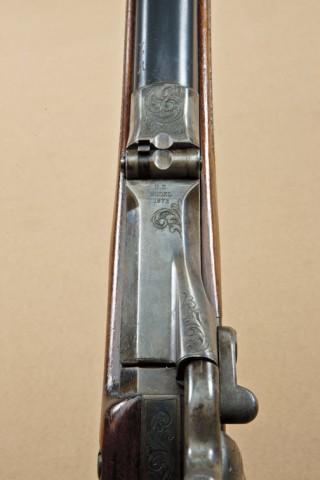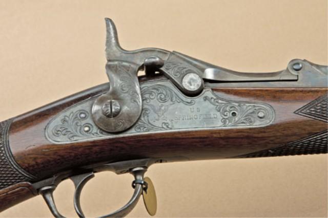 Springfield Model 1875 US Trapdoor Officers model, 2nd type, with checkered wood removable pistol grip, refer Flayderman 9A-368. The rifle shows no rear tang sight and the area where the tang sight normally inletted into the wrist and has been arsenal checkered and filled with a plug by same hand that checkered the stock. There is a small “78” stamped just behind the tang, which is also unusual. The rifle shows approx. 95-98% original blue on barrel, just some slight aging and a few pinpricks just starting. The lock, breech, and hammer show 70-80% original case hardening slightly drifting to silver with minor spotting and erosion and some very good rainbow colors still showing. The inside of the triggerguard shows a “22” stamp. The stock is fine to near excellent with crisp checkering and no evidence of cartouche other than “P” behind the checkering in the belly of the stock. The buttplate has drifted to a silvery grey, matching to the barrel band, with some minor spotting and erosion. The original front and rear sights are retained and the front sight is a blade German silver post-type intended for use with the rear barrel sight rather than the normal beech type folding globe front sight w