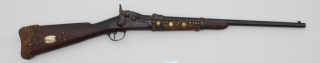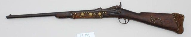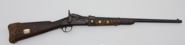 Springfield Model 1878 carbine .45-.70 caliber. Serial # 19322X last digit not legible. The carbine has been period decorated by Southwest Indians probably Apache Tribe discovered 1960’s near Yuma,Arizona. We first became aware of this carbine when it was in a sheriff’s collection in the Yuma area who displayed it at the Old Armory Show. By tradition the sheriff took it off a local whose great grandfather usedit as a scout for the prison when he tracked escaped prisoners. We identified it by the unique large brass ornaments and we next examined the gun in the 1980’s when offered for sale by Troy Galleries, Scottsdale whohad obtained it from the sheriffs heirs. Troy Galleries sold the gun to a prominent Western Artist who used it in his paintings and displayed it in his Western theme bar room from the 1980’s until Little John’s Inc. acquired it from him. The carbine shows a dark brown patina with scattered pitting and erosion. The stock is wrapped with thick hide with hair still attached. The stock is decorated with well aged genuine to the