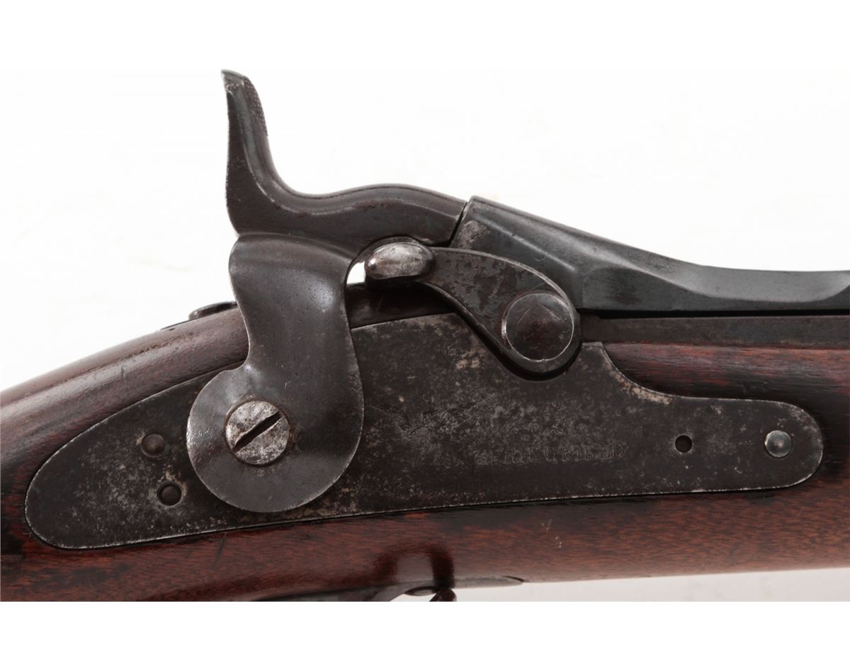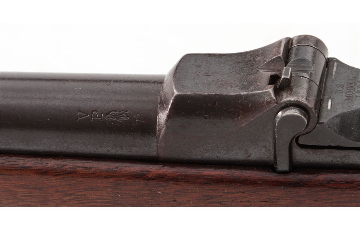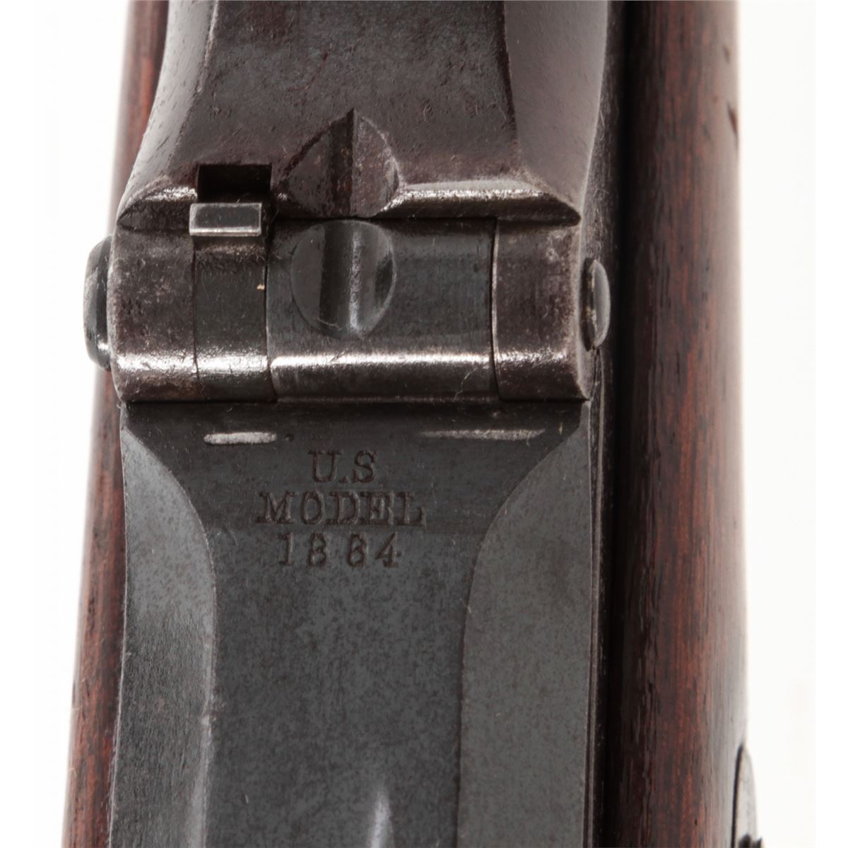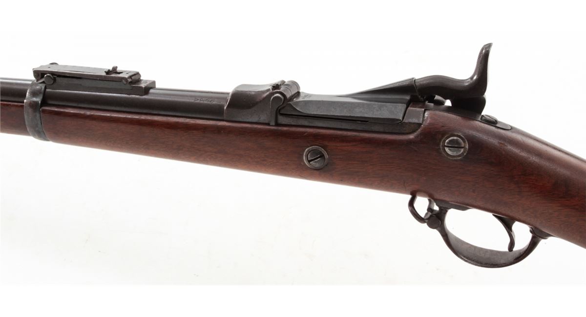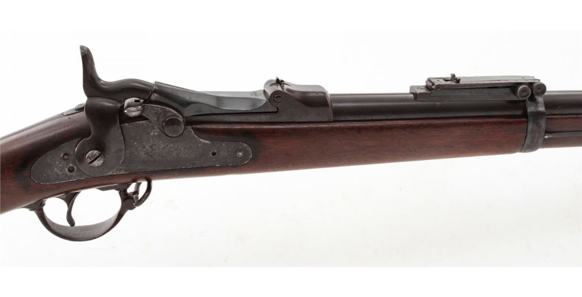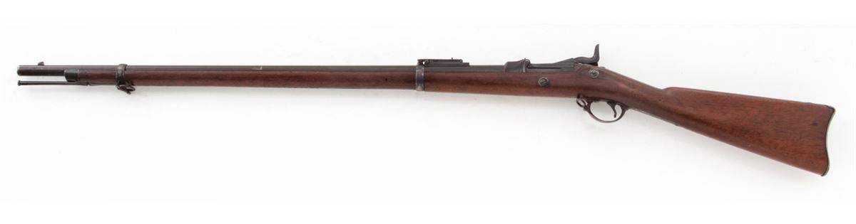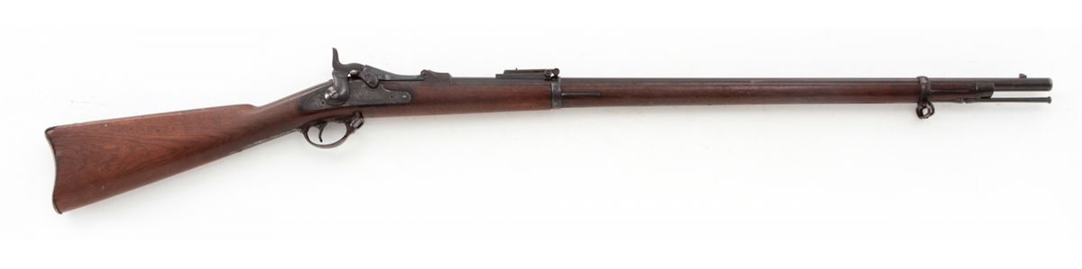 Springfield Model 1879 Trapdoor Rifle, #212699, .45-70 cal., 32'' barrel, blue finish, walnut stock, with early button-tipped cleaning rod. Breechblock is marked 1884. Condition is very good retaining approx. 90% lightly thinning and toning blue to barrel. Breechblock has been later arsenal reblued and may be a slightly later replacement. Triggerguard and buttplate with light to moderate corrosion. Stock shows light sanding with oil darkening around lockplate. Cartouches are not visible. Action is crisp, bore is bright. A nice late 1870s to early 1880s Trapdoor rifle. Est.: $500-$750. (Antique)