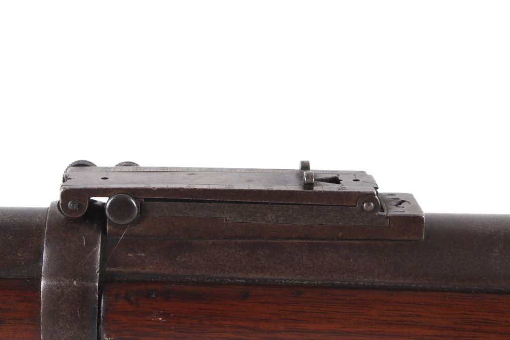 Very fine Model 1884 Springfield .45-70 caliber cavalry saddle ring carbine, serial number 448860. This is a nice carbine made in 1889 with correct sling ring bar. It also has the Model 1884 Buffington ladder rear sight that is adjustable for windage and long range elevation with either “peep” aperture or “V” notch for sighting, etc. This is a true original U.S. issued carbine made for the Indian Wars. Uncleaned, naturally aged metal has a smooth dark aged blue/brown patina and shows no evidence abuse or cleaning. This as-issued carbine has the correct U.S. MODEL 1884” marked breech block, with the correct “U.S. SPRINGFIELD” marked lock plate with eagle motif and all correct barrel “VP” over “eagle head” proof marks on the original 22 inch barrel. It has excellent mechanics and excellent bore displaying fine rifling. The walnut stock is in particularly excellent condition retaining two crisp inspection cartouches at the wrist and a light circle P cartouche behind the lower tang. The butt plate has the correct sliding door to cover the compartment for a jointed cleaning rod and this example retains its three-piece rod. The steel butt plate is also correctly “U.S.” marked on the top portion along with a “12” stamping which was no doubt a rack or unit number. This is the standard model that was used in every major engagement from the Battle of the Rosebud and Battle of the Little Bighorn to Wounded Knee. This is a fine, uncleaned, attic-condition, attractive example with wonderful Western