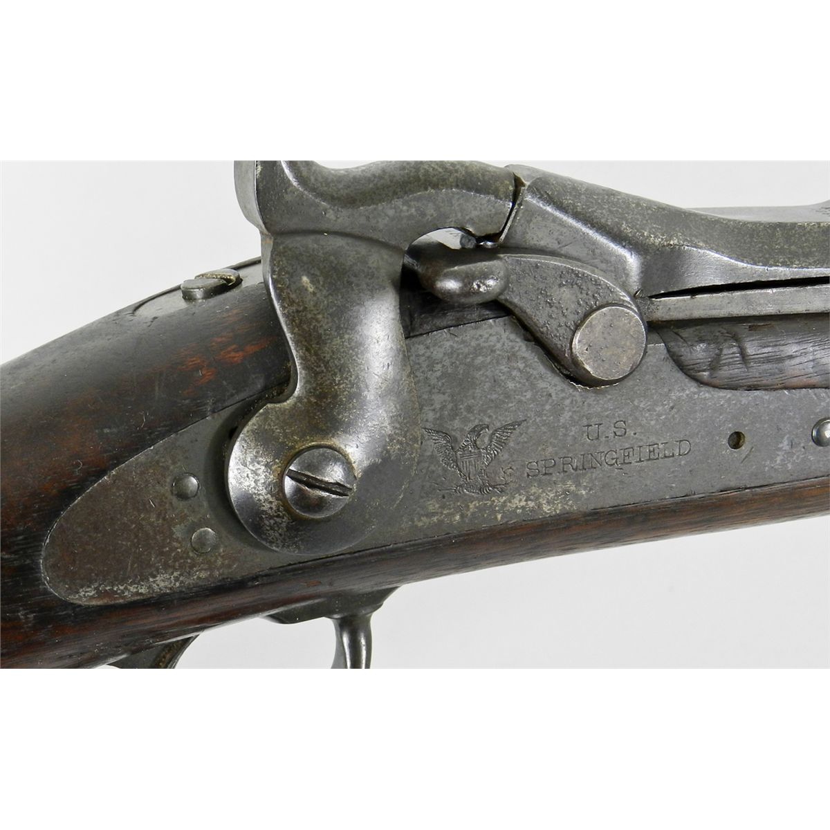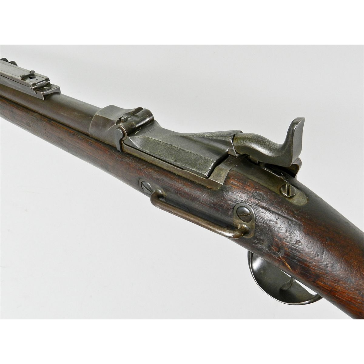 U.S. Model 1890 Trapdoor Carbine, by Springfield, #414505, .45-70 cal., 22'' barrel, blue finish, walnut stock. Breechblock dated 1884. Although no Carbines were mfg'd after 1889 and the Model 1890 is purely a collector's term, these Carbines feature specific government alterations with a special protected barrel band. The band has a high hump which acts as a buffer to the sight when it is slipped into a Carbine boot. The front sight of this Carbine features no modification. Condition is good overall. Finish shows thinning, toning, and light corrosion. Stock with some darkening and scuffs. Action functions well, bore is dark. Est.: $600-$800.