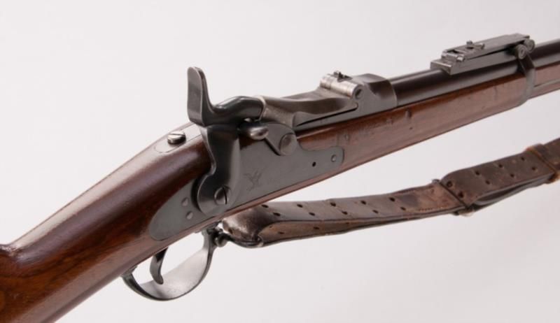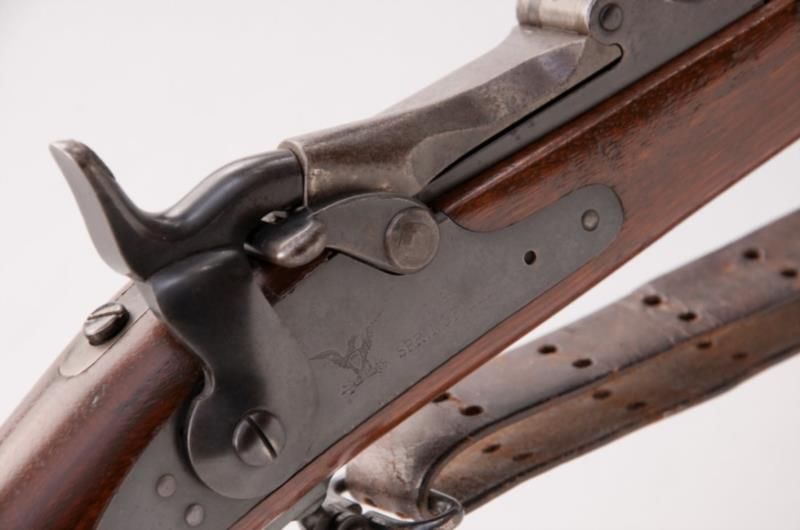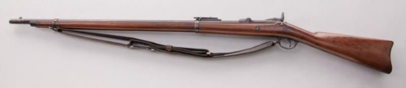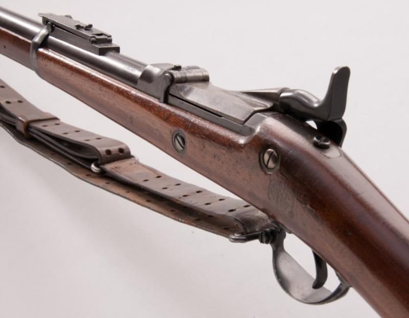 Springfield Model 1884 Trapdoor Rifle, #416396, .45-70 cal., 32'' barrel, blue finish, case hardened breechblock, smooth two-band walnut stock, with slightly later military sling. Breechblock dated 1884; cartouche appears to be 1888. Condition is very good retaining approx. 90% lightly thinning and toning blue to barrel and frame. Breechblock shows thinning and minor brown/gray discoloration. Hammer, lockplate, triggerguard and buttstock retain approx. 95% blue. Stock with additional coat of linseed oil. Action is crisp, bore is fine and should clean to mirror bright. Missing ramrod.
