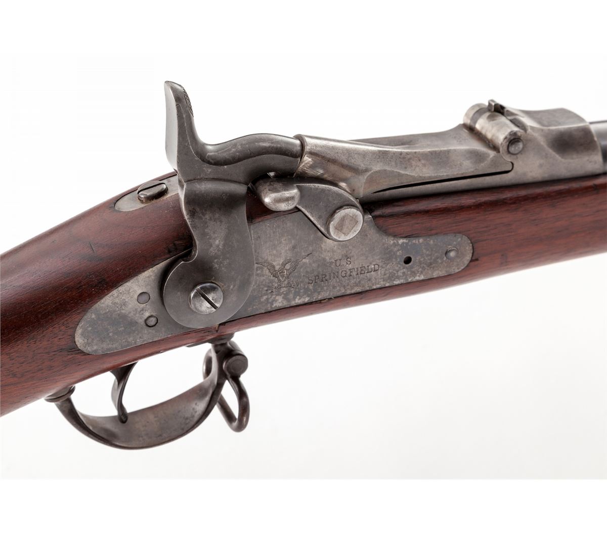 U.S. Model 1884 Trapdoor Rifle, by Springfield, #345726, .45-70 cal., 32'' barrel, blue finish, case hardened breechblock, 1885 cartouched walnut stock. Condition is excellent. Barrel assembly retains approx. 94% blue; case hardened breechblock is about the same, with some thinning and spotting. Lockplate has thinned to approx. 60%. Stock with only light marks from handling and no evidence of sanding. Action is good, bore is bright, ramrod is present. Est.: $1,200-$1,800. (Antique)