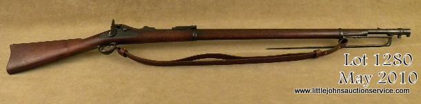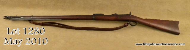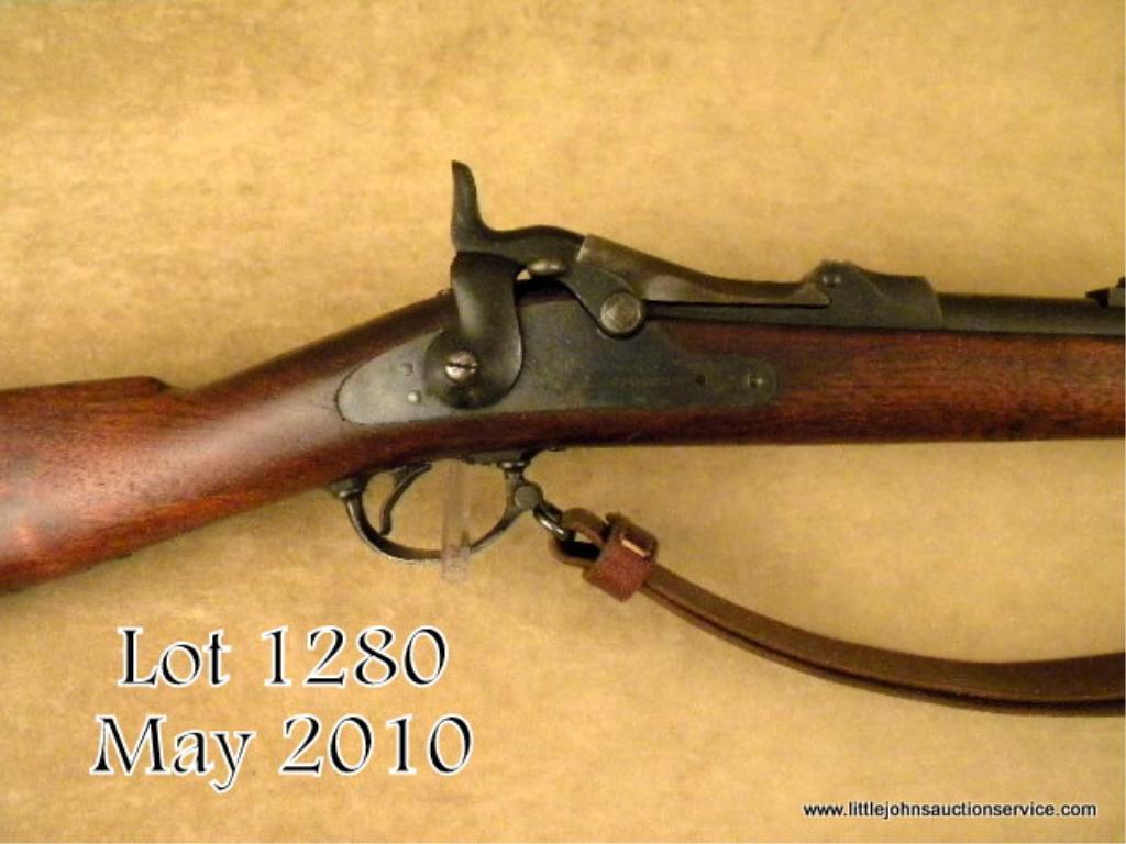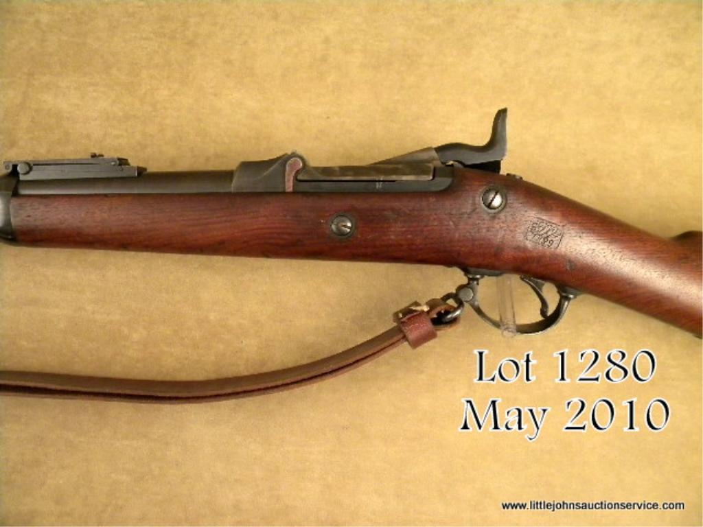 Springfield Model 1884 Trapdoor rifle45-70 cal #468091. In near fine condition with 80-90%original toning blue finish, case hardening dulled on breech block, stock shows strong SVM 1889 cartouche and is very good plus with a fewdings, mars, slight losses and minor imperfections. With cleaning rod and bayonet. In like new condition. Bore minty and bright. A hi-grade trapdoor. Est. $600-$1,200.
