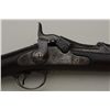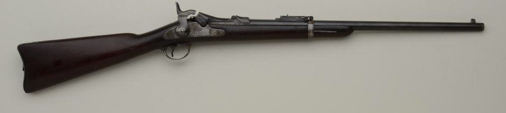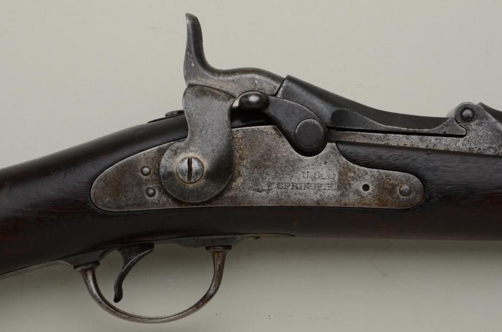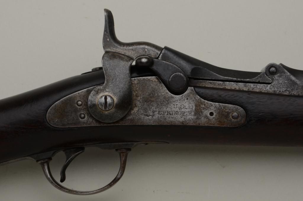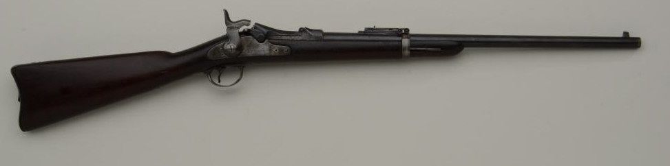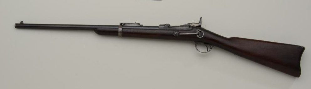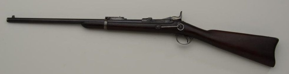 Springfield Model 1884 trapdoor carbine in .45-70 caliber, serial number 380936. This carbine remains in original good condition showing 40% to 60% original blue on barrel that is evenly drifting and toning with someminor scattered erosion and pinprick pitting on the edges. The lock plate, frame and hammer have drifted to a grayish patina with some scattered erosion and pinprick pitting also. The markings on the lock are good. Thestock is also good but shows no trace of cartouches. There has been some oiling to the stock with what appears to have been linseed oil which has darkened it slightly. The stock is good with a few mars, dings and etc. This carbine retains correct late sight, carbine bands, butt plate and all carbine features. Action is good and the bore is at least good and still shining. Est.: $800-$1,600.