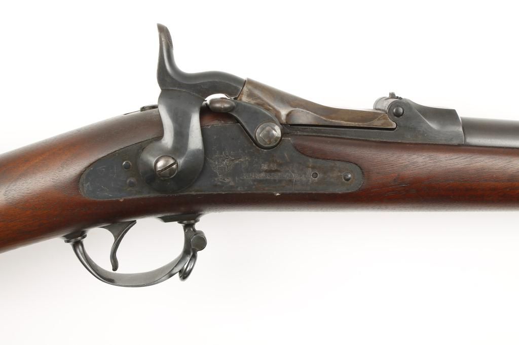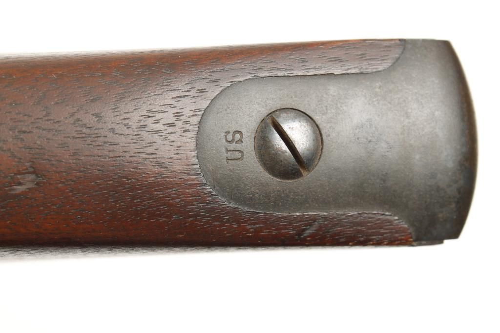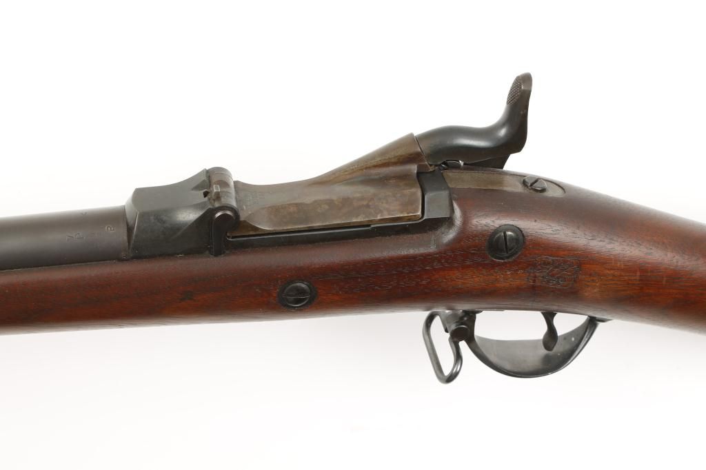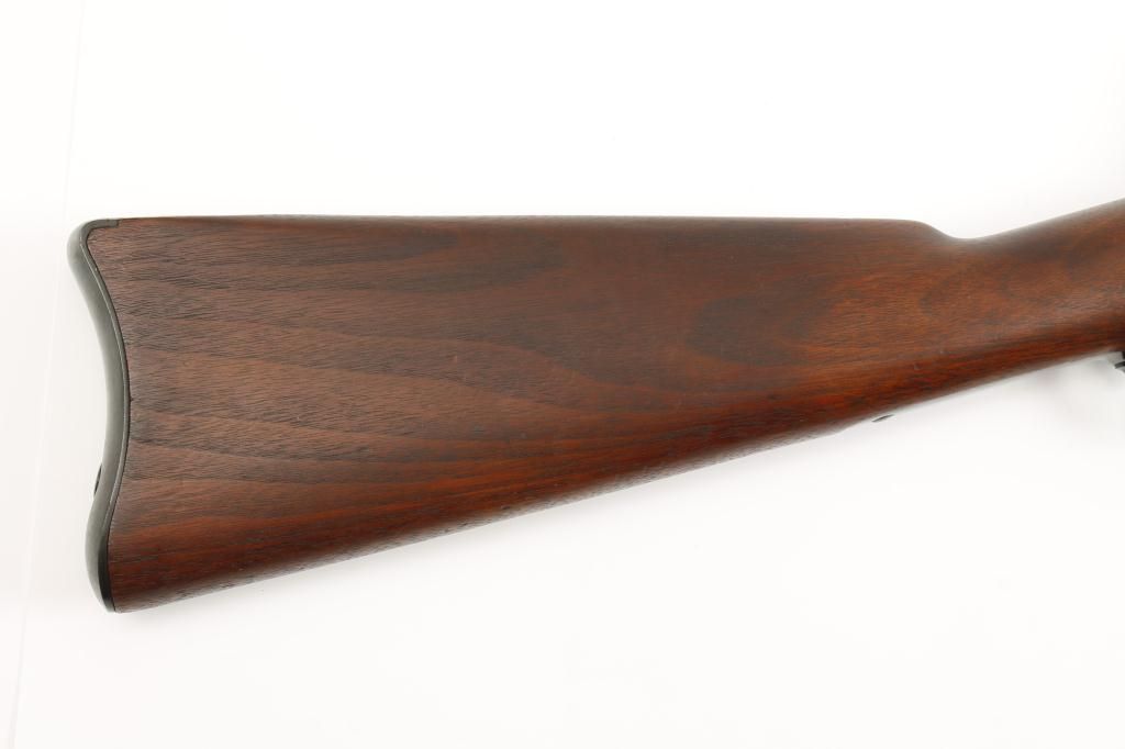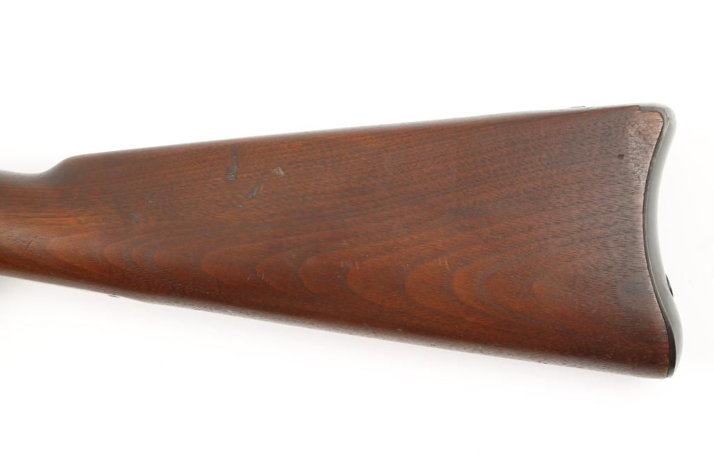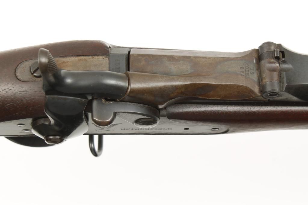 Springfield Model 1884 trapdoor rifle in .45-70 caliber remaining in near fine original condition, serial number 459104. The barrel shows 90% to 95% plus original blue just starting to age nicely. The lock plateshow 75% original blue with sharp markings. The breech block and tang show 50% case hardening going to brown. The stock is in near fine original condition with no losses along cleaning rod channel and sharp edges.Crisp 1889 SVW cartouche with P cartouche behind trigger guard. The trigger guard shows 95% bright original blue and the butt plate shows 50% toning original blue. The bands, sights, and small parts all show considerable original finish. The action is good and the bore is excellent. An original cleaning rod is retained. The front sight is oversized and an old replacement. A strong 8 ½ on 1 to 10 scale with a very exceptional stock. Est.:$1250-$2500