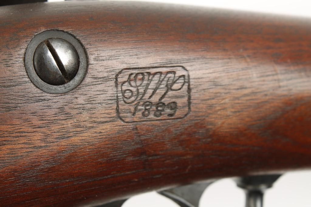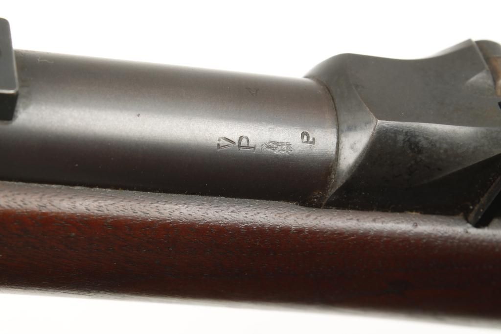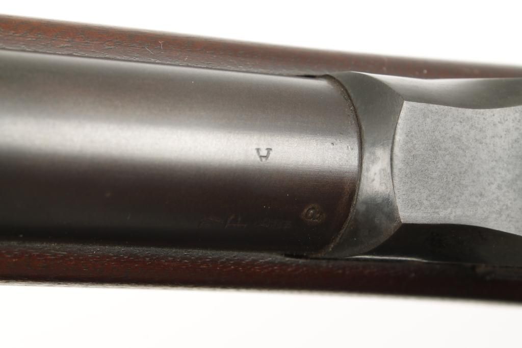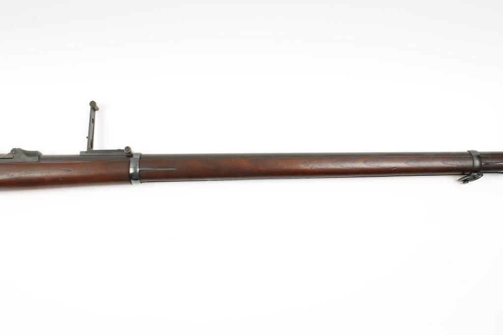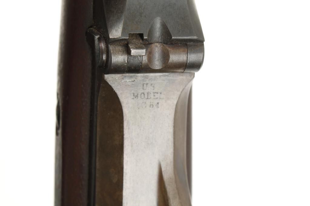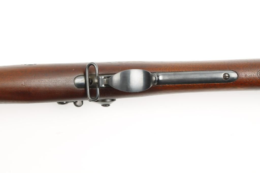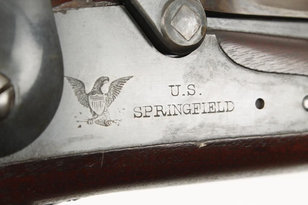 Springfield Model 1884 trapdoor rifle in .45-70 caliber remaining in near fine original condition, serial number 459104. The barrel shows 90% to 95% plus original blue just starting to age nicely. The lock plateshow 75% original blue with sharp markings. The breech block and tang show 50% case hardening going to brown. The stock is in near fine original condition with no losses along cleaning rod channel and sharp edges.Crisp 1889 SVW cartouche with P cartouche behind trigger guard. The trigger guard shows 95% bright original blue and the butt plate shows 50% toning original blue. The bands, sights, and small parts all show considerable original finish. The action is good and the bore is excellent. An original cleaning rod is retained. The front sight is oversized and an old replacement. A strong 8 ½ on 1 to 10 scale with a very exceptional stock. Est.:$1250-$2500