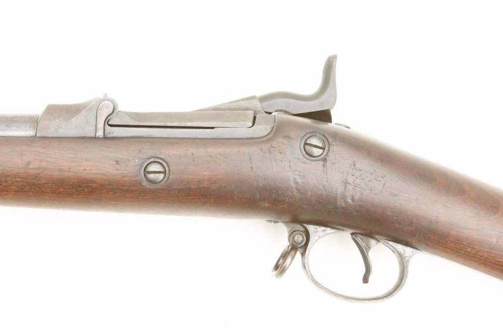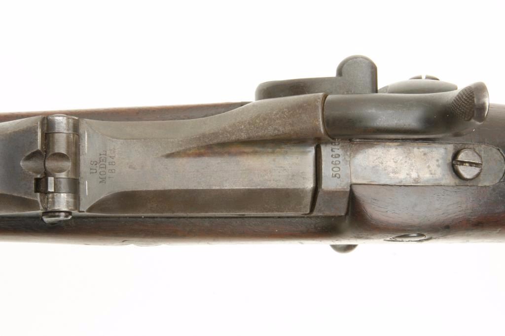 caliber, S/N 506678. Very good stock showing use and cartouched “S.W.P. 1890”. All correct with nice bore and case hardened breech block. 60%-80% bluing remains with some purple patina. A very nice example of a 1888 Springfield. (Antique) Est.: $700-$1400