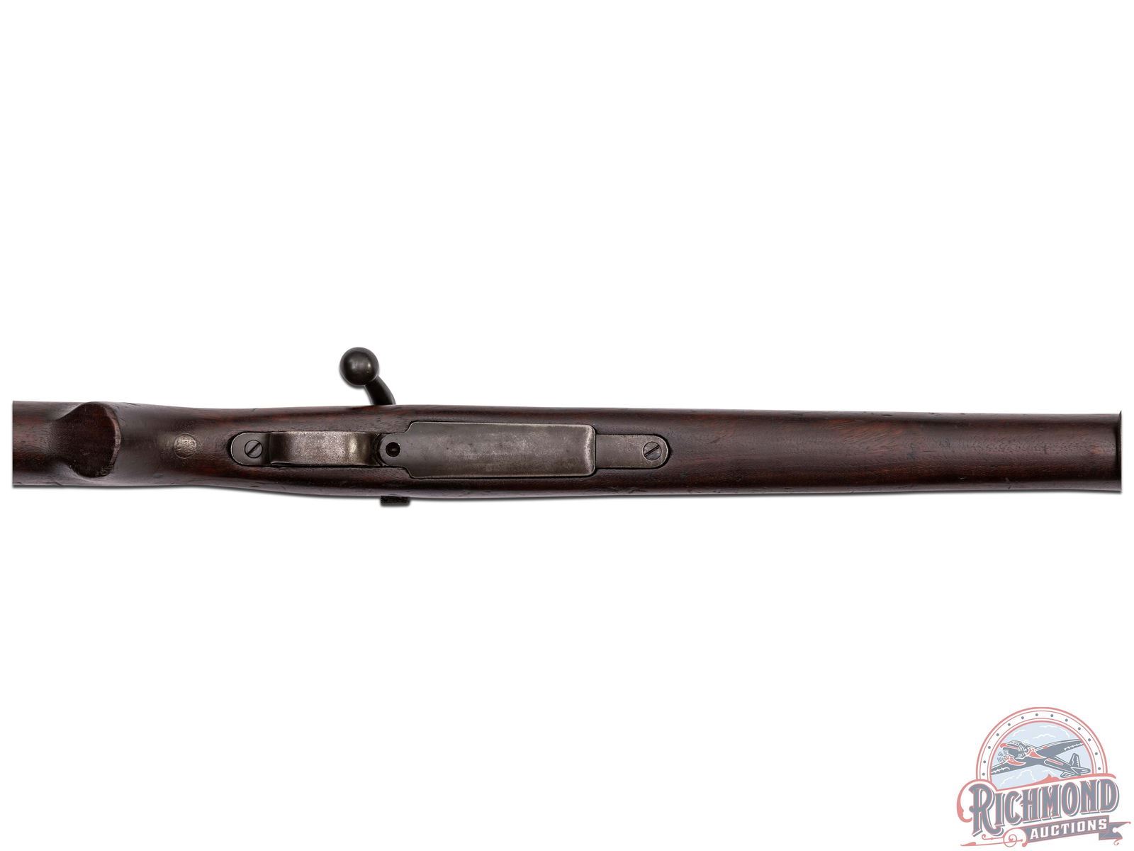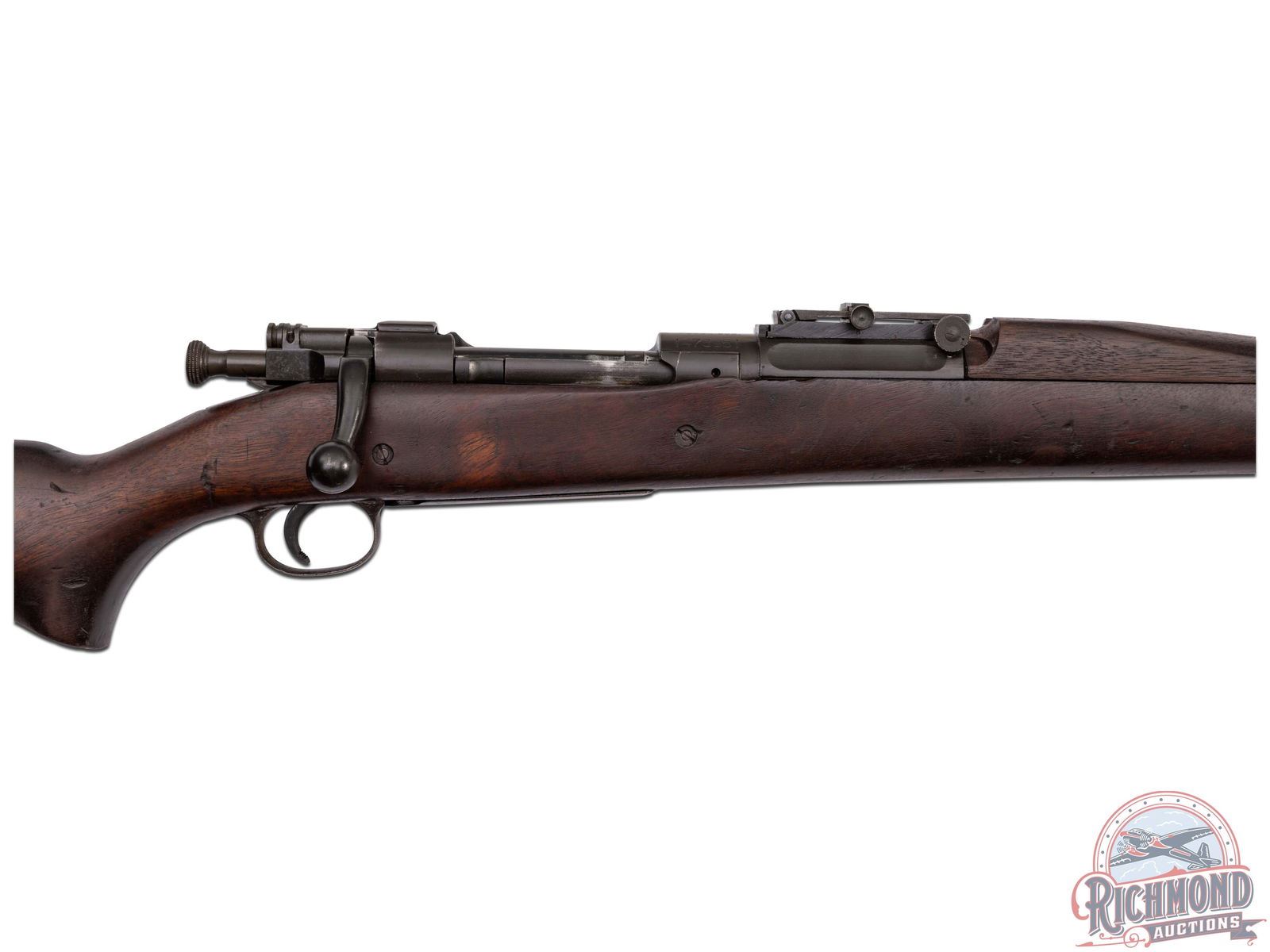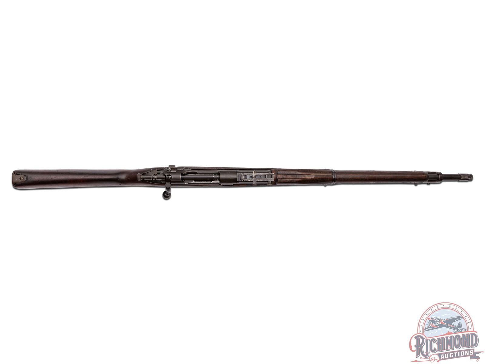 Made by Springfield Arsenal in 1934 and rebuilt for World War II. 24" blued round military barrel in 30-06 caliber with "SA/FlamingBomb/11-34" barrel marking. Standard military front blade sight and 2800 yard rear graduated sight. Black Parkerized action with Springfield marked receiver and swept handle bolt. Standard safety and trigger. Walnut "C" stock with "A.A.H." Augusta Arsenal, World War II rebuild stamp. Blued milled floorplate and trigger guard with checkered butt plate. Matching walnut humped top wood. CALIBER: 30-06. S/N: 1478951. FFL STATUS: Curio & Relic.