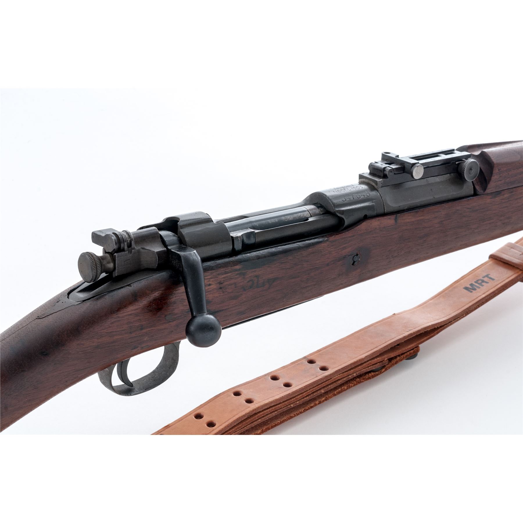 Springfield Model 1903 Bolt Action Rifle, #347648, .30-06 cal., 24'' barrel, parkerized finish, walnut stock, blade front sight and adjustable folding leaf rear sight. Marked on receiver ring ''U.S.SPRINGFIELD ARMORY MODEL 1903'', and on barrel behind the front sight ''U.S.M.C. 10-43 (circle S)''. There is a faint ''FJA'' stamp on the left side of the stock and a ''circle P'' firing proof on the underside of the wrist.  Condition overall is very good with over 80% of the re-parkerized finish remaining on the metal,which has areas of rust spots and brown patina. Stock has a wood splice and two wood putty repairs and has been sanded and refinished, showing light handling marks. Action is smooth, bright bore is very good with sharp rifling.  Rear sight bed is slightly loose.  Includes a U.S. leather sling in very good condition marked ''MRT'', and a British Pattern 37 rifle case in good condition. Also included is a U.S. military compass dated ''2-81'' in good condition.  Est.:  $500-$750. (C&R)