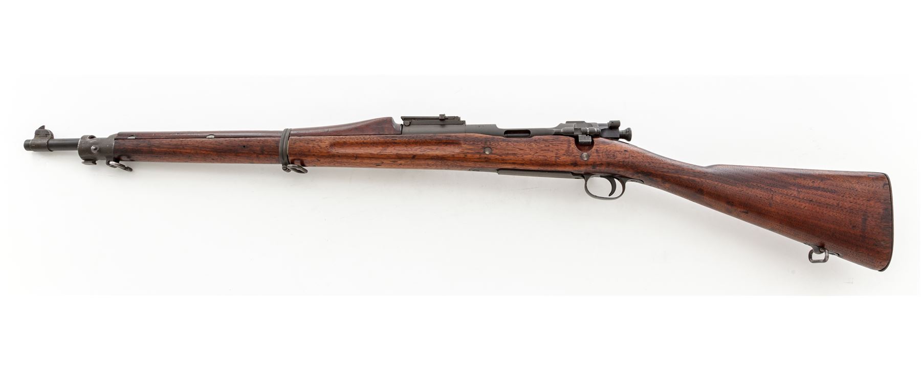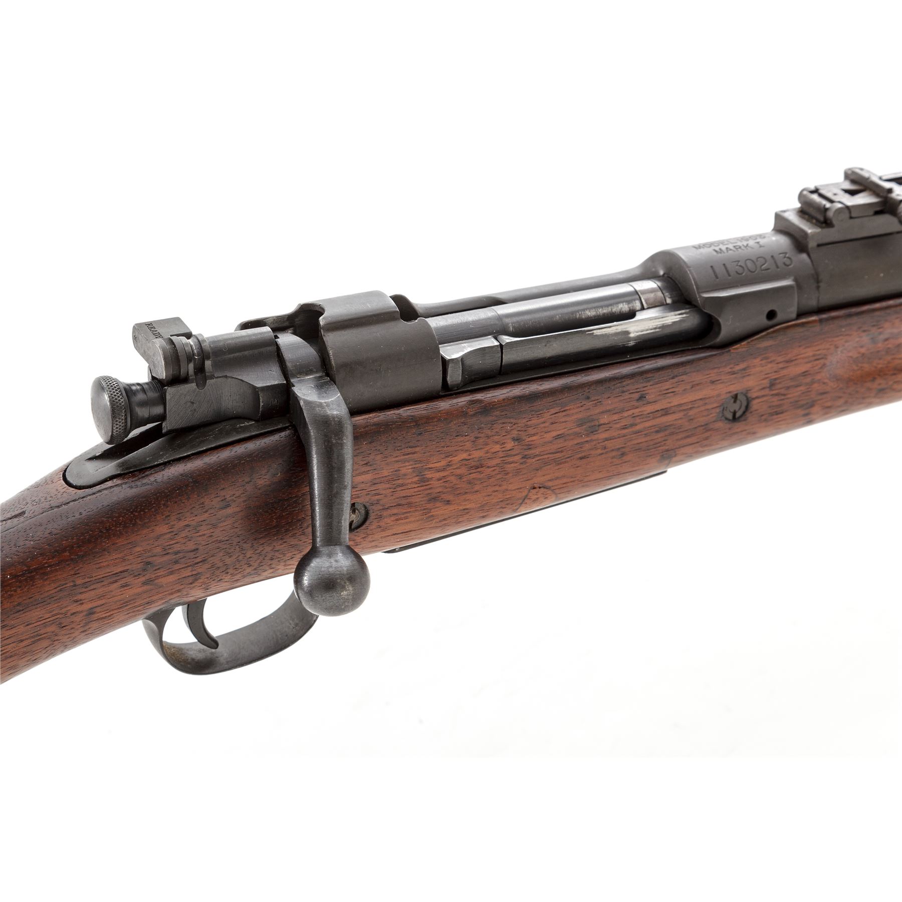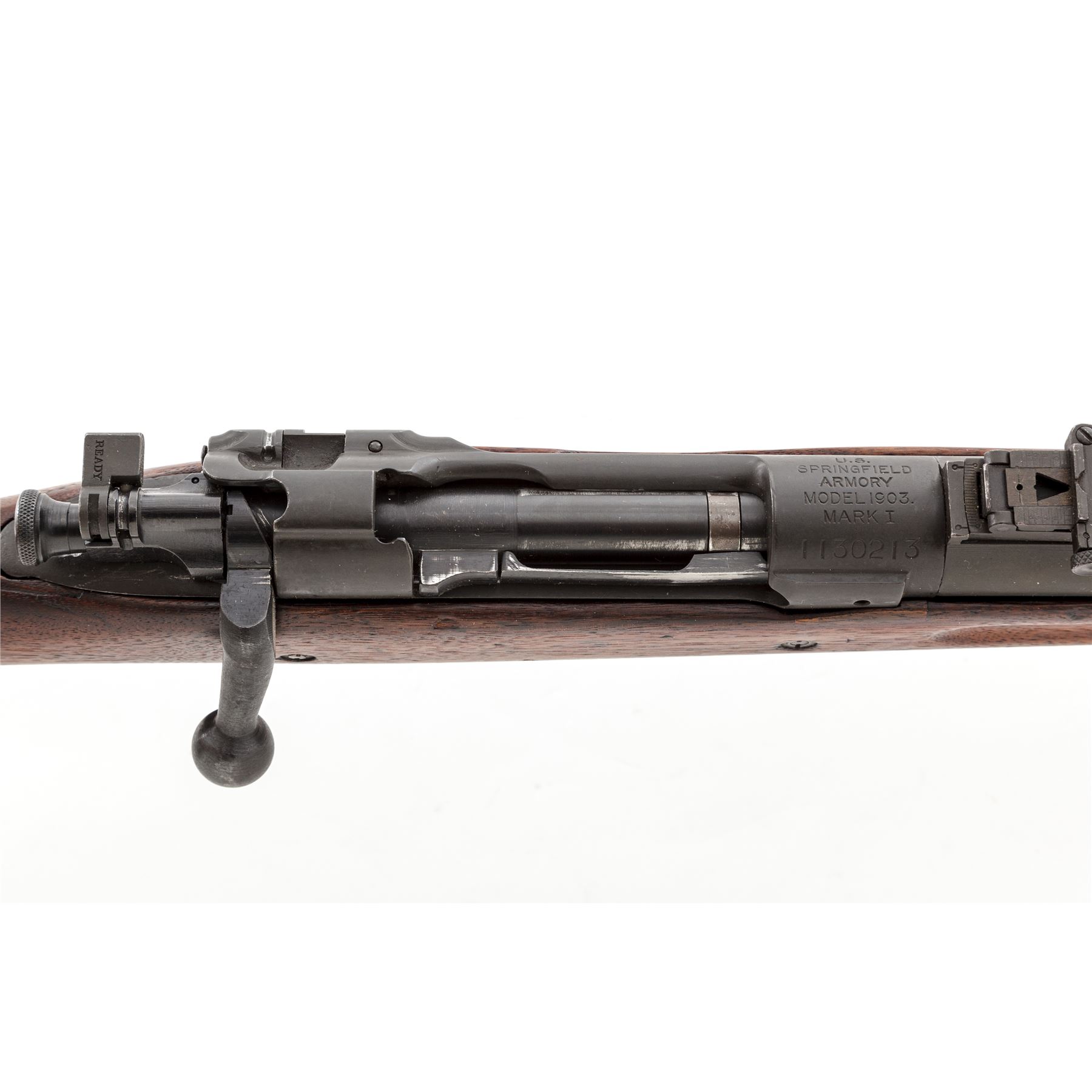 Springfield Model 1903 Mark 1 Bolt Action Rifle, #1130213, .30-06 cal., 24'' barrel, parkerized finish ,walnut stock, blade front sight and adjustable folding leaf rear sight. Marked on receiver ring ''U.S.SPRINGFIELD ARMORY MODEL 1903 MARK 1'', and on barrel behind front sight ''S-A/(flaming bomb)/7-42''. ''R'' stamp on bolt handle, with early handguard. There are faint boxed cartouches on left side of stock wrist and a faint circle ''P'' firing proof on underside of wrist. Condition overall is very good with the metal retaining over 90% finish. Stock has an arsenal repair and burn mark on right side, otherwise, wood is very good showing sanding and an applied semi-gloss finish. Action is smooth, bore is very good. Includes a Civilian Marksmanship Program Certificate of Authenticity and CMP shipping box. Est.: $700-$900. (C&R)