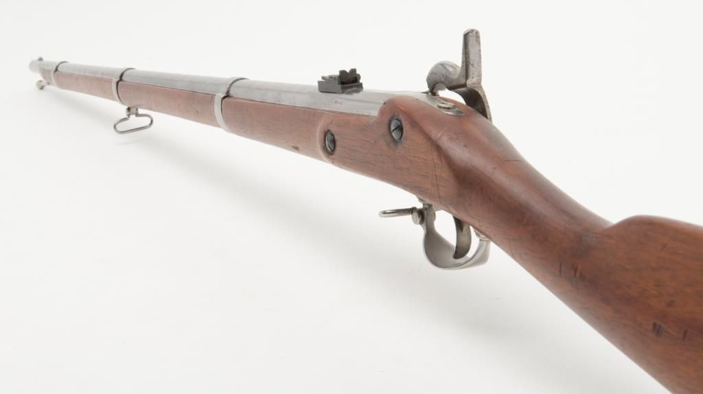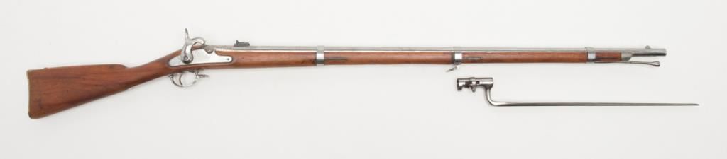 Springfield Musket, approximately .50 caliber, Serial #NSNV. The rifle is overall fair to good condition with a 38” barrel, replacement rear sight and socket bayonet. The barrel and several other metal parts have been polished to a brightfinish. The lock is marked “Providence Tool Co. Providence, R.I.” and dated 1862. The smooth wood stock has been sanded and is in fair condition overall with small mars and compressions. The butt stock ends with a crescent, brass butt plate. (Antique) Est.: $1,000-$2,000.