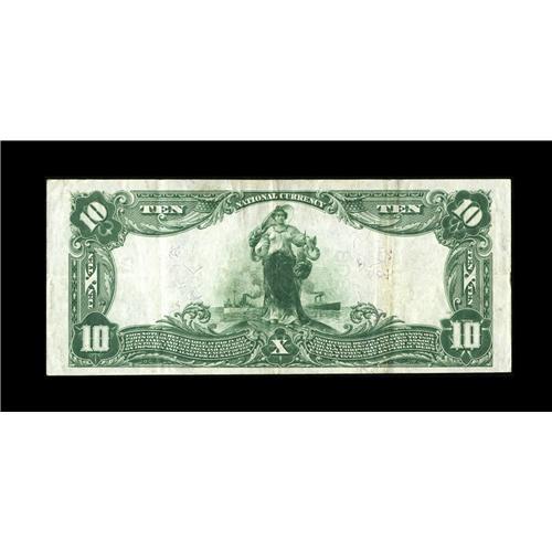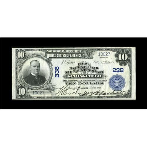 <B>Springfield, OH</B></I> - $10 1902 Plain Back Fr. 624 <B>The First NB & TC</B></I> Ch. # 238<BR>Although this is by no means a scarce bank, the note we offer tonight is only the second $10 Plain Back to emerge from the darkness with this title. <B>Extremely Fine,</B></I> with nice margins, bright color and vivid officers' signatures.