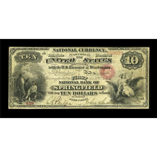 <B>Springfield, OH</B></I> - $10 Original Fr. 409 <B>The First NB</B></I> Ch. # 238<BR> This piece was obtained by Tom from our very first CAA sale in November, 1990, where we described it as "A nice evenly circulated Original Series $10." It is indeed just that, and one of a scarce and still undervalued type, with only about 250 pieces known nationwide, about 10% of which come from Ohio. <B>Fine.</B></I><BR><I>From The Thomas M. Flynn Collection</B></I><BR><BR><b>Shipping:</b> Coins & Currency (<a target="_blank" href="http://www.heritageauctions.com/common/shipping.php">view shipping information</a>)