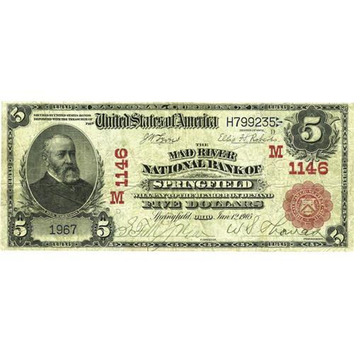 <B>Springfield, OH</B></I> - $5 1902 Red Seal Fr. 587 <B>The Mad River NB </B></I> Ch. # (M)1146<BR>The signatures are quite strong on this newcomer to the population. Couple a great title with a Red Seal and you have a note worthy of your bid. No problems are noted. <B>Fine+.</B></I>