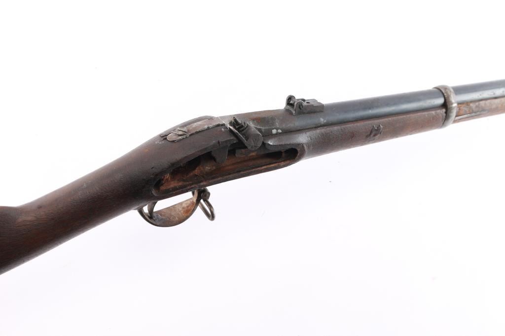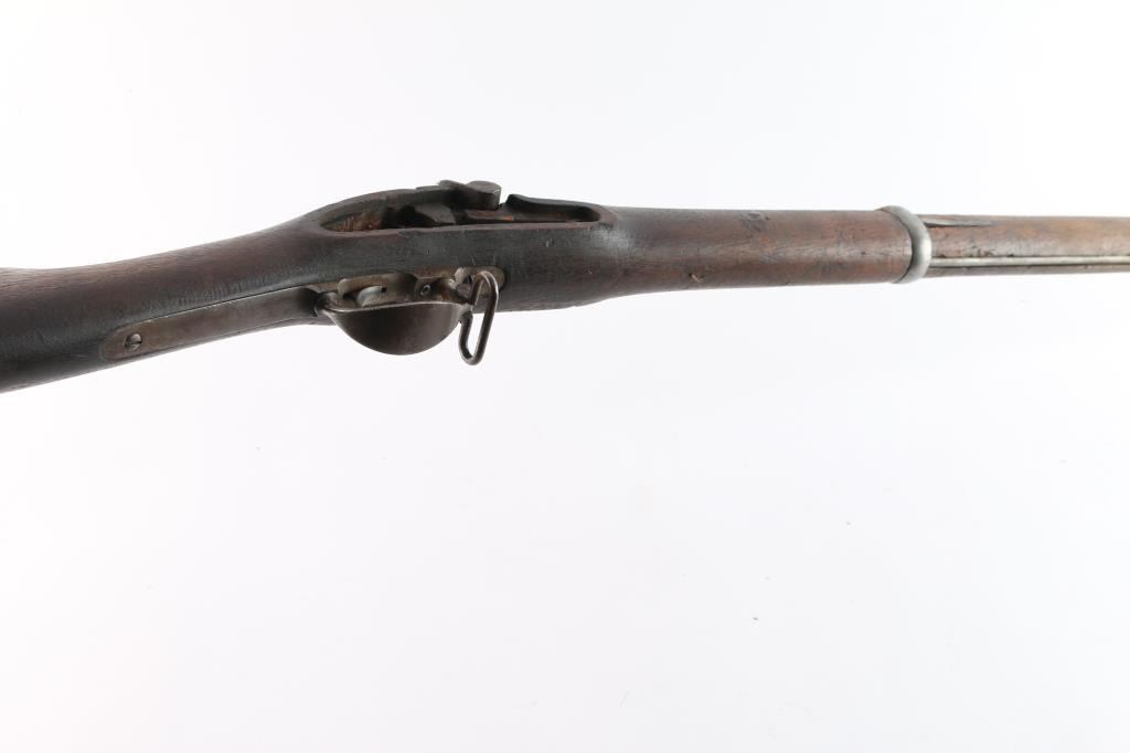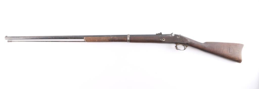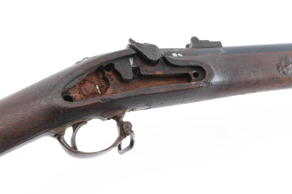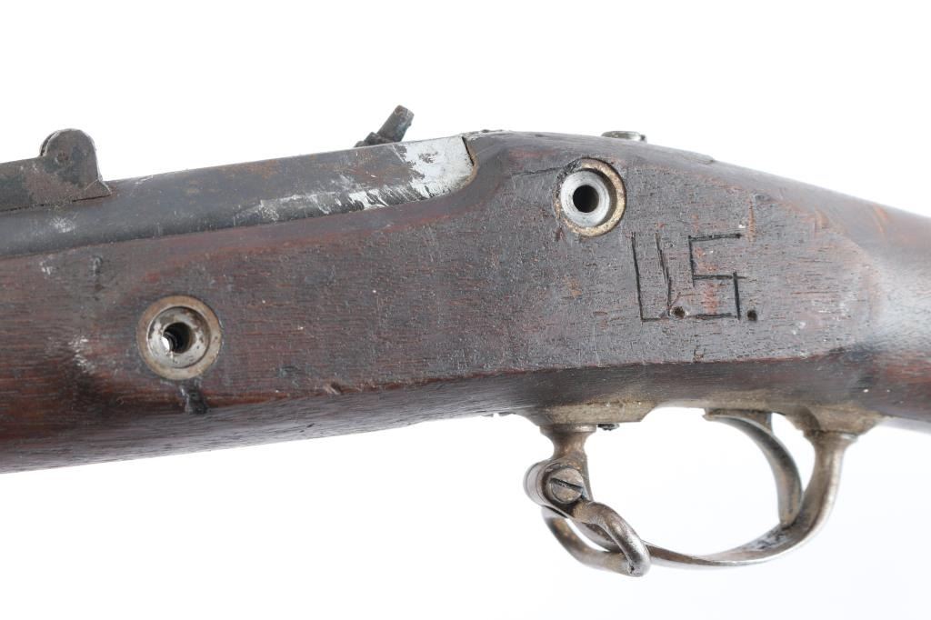 A Springfield, Model 'Unknown', .58 caliber musket showing period alterations and conversion to nipple in barrel, along with a hammer change. It features a stock reduced to half, a 39" barrel, smooth curved trigger, ram rod, smooth steel buttplate, and smooth straight grip stock. This rifle is for parts or repair because it is missing a number of parts. There is rust and patina throughout, the sights are incomplete, and the hammer and fire control group is missing. The bore is hard to inspect, but there appears to be visible rifling. The stock looks serviceable, and has light handling marks with 'U.S.' and other markings carved into the left side of the stock. There are Springfield parts on this rifle.