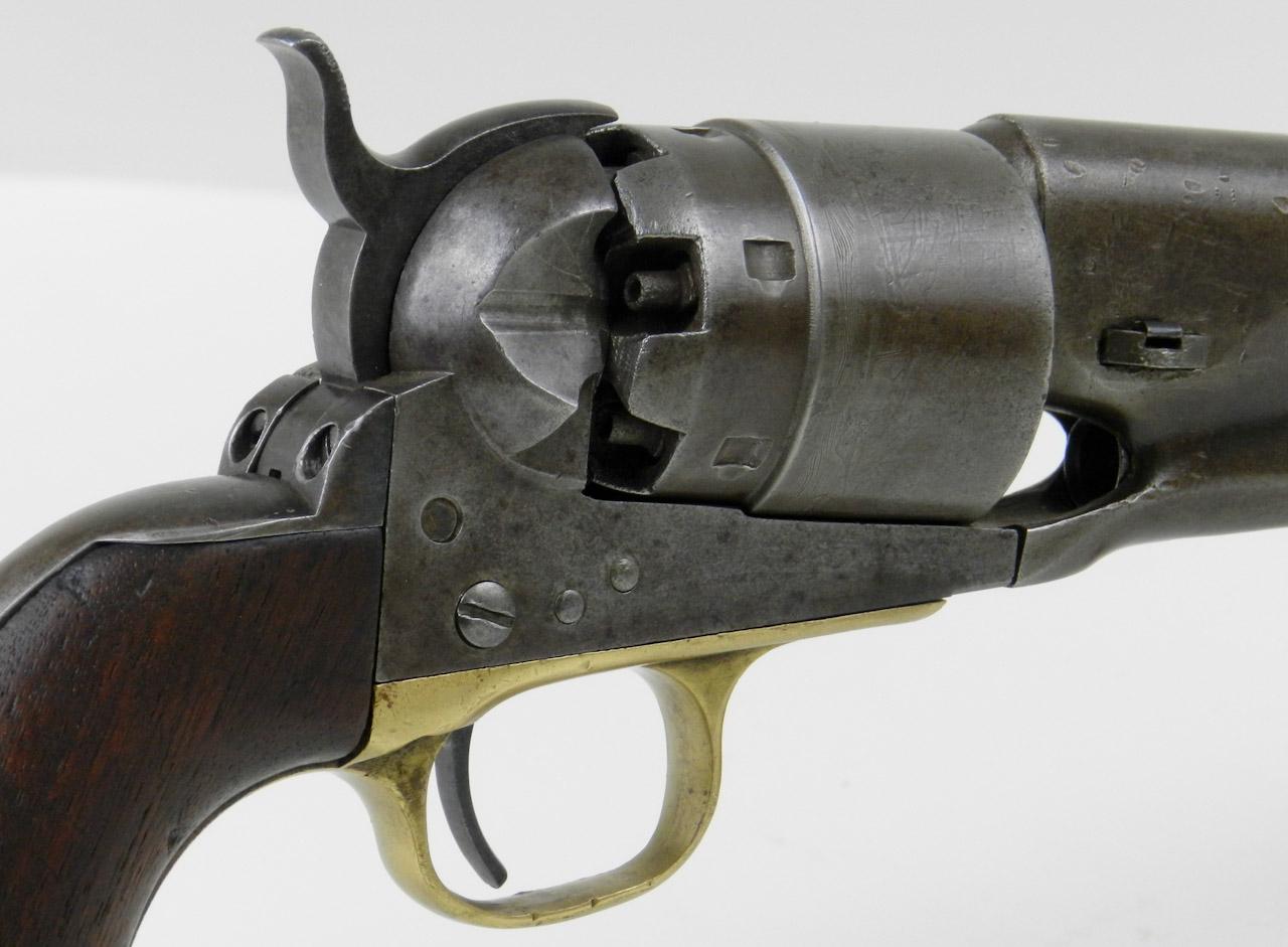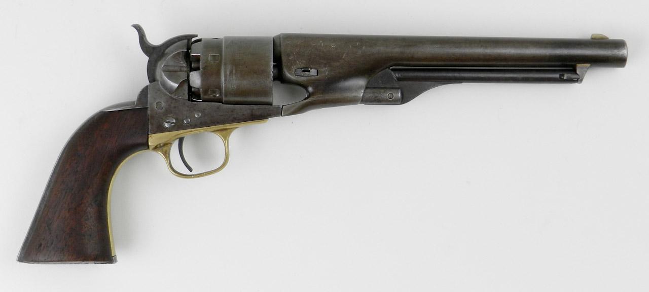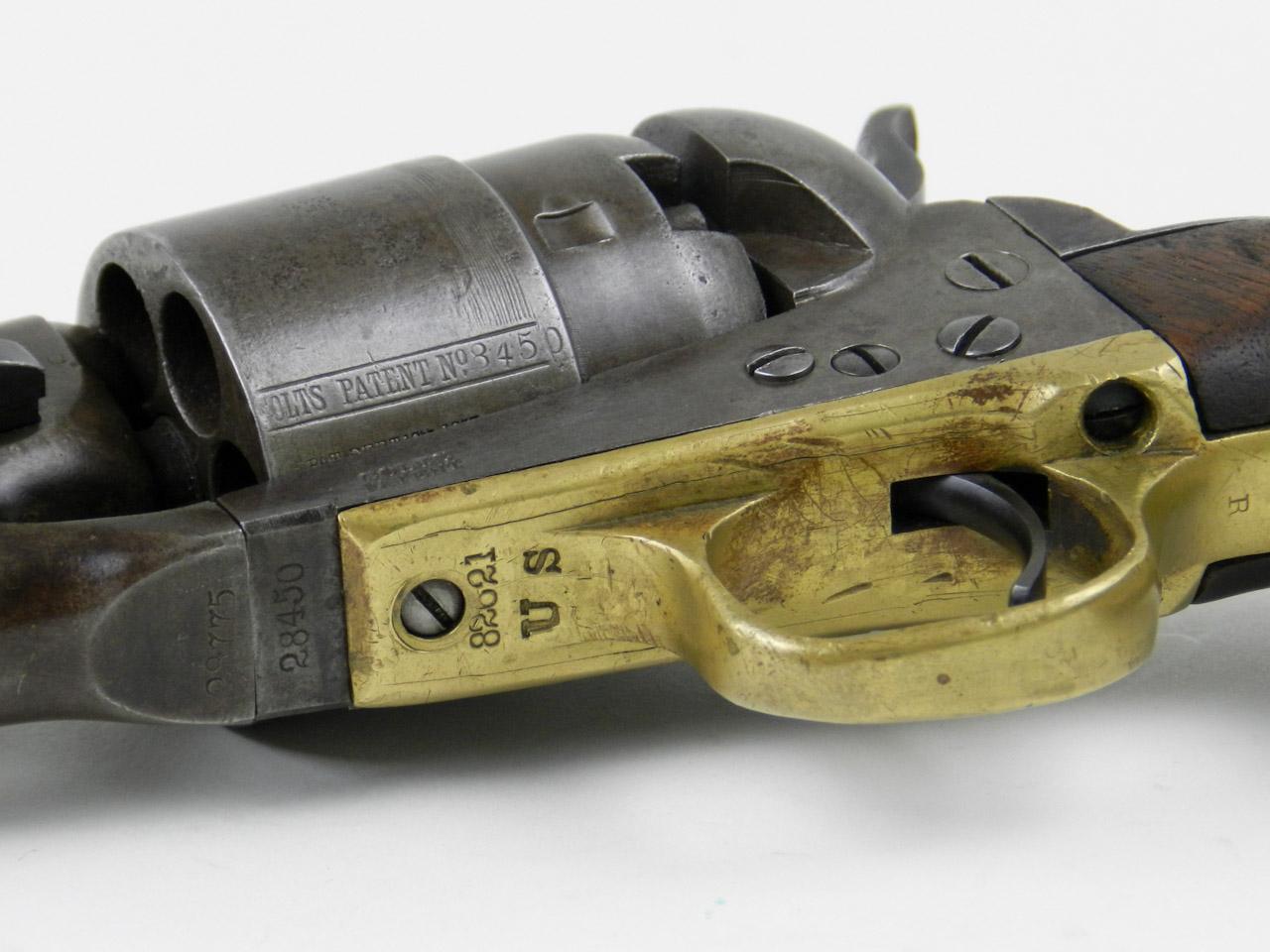 Springfield Armory Re-Work of Colt 1860 Army Percussion Revolver, #28450, .44 ball, 8'' barrel, blue and case-hardened finish, one-piece walnut grips, four-screw frame, New York address to barrel, serial number to frame matches cylinder (28450), barrel assembly (28775), triggerguard (82621), with large and correct ''US'' marking forward of triggerguard bow behind serial number. Iron backstrap marked #114835, with unmarked wedge. Condition is very good to near fine as re-built by the Springfield Armory. Barrel assembly shows approx. 60-75% thinning and toning blue. Frame has toned to silver, but case-hardened hues remain internally. Inspector's initials ''C'' to both sides of barrel lug, with additional ''C'' to the rebated area of cylinder, as well as ''B'' to high edge of cylinder. Grips show scuffs, scratches and losses, including a long thin loss near the right side of backstrap. Touch holes are clear, safety pins are present but flat. Action is tight, pawl sp!