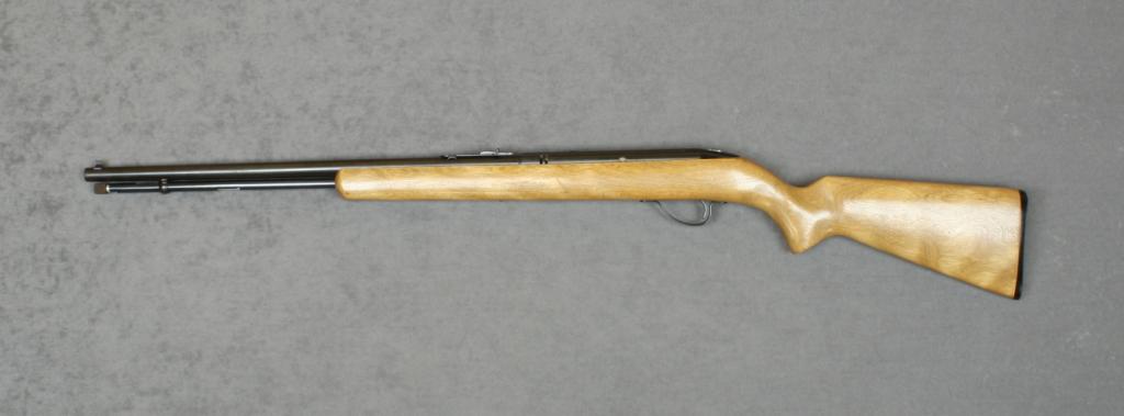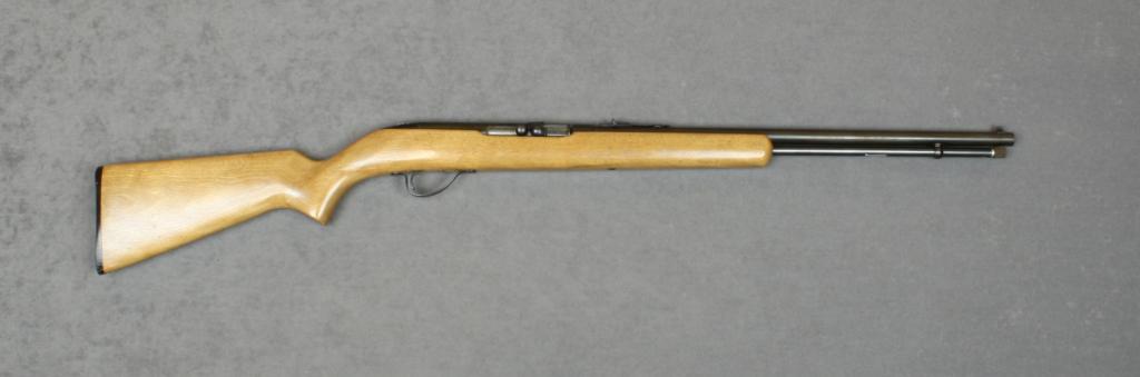 Springfield Savage Model 187K semi-auto  rifle, .22 cal., 20” round barrel, blue  finish, blonde wood stock, #NVSN. This gun is  in overall fine condition showing approx.  90% original finish, fine bore, very goodaction, fine wood stock; interesting in that  this gun is marked “.22 H.S. Short, Long or  L.R. as Auto.” calibers.  Est.:  $100-$200.