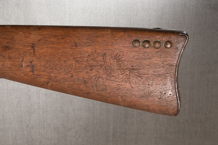 Springfield Trap-Door Rifle, Model 1866. 32" barrel. 50-70 caliber. Captured and used by Indians and shows heavy use. Tacked with some detailed, though somewhat worn, pictograph carvings on one side of the stock.